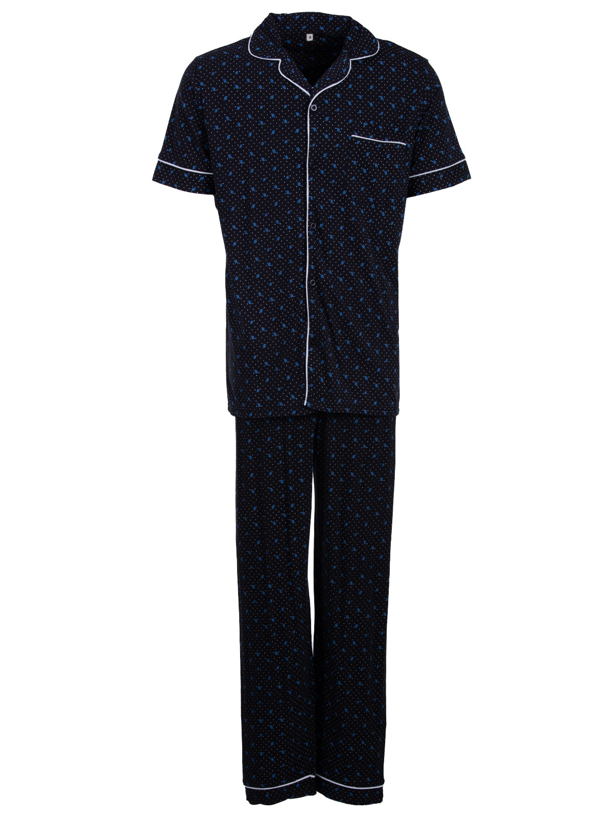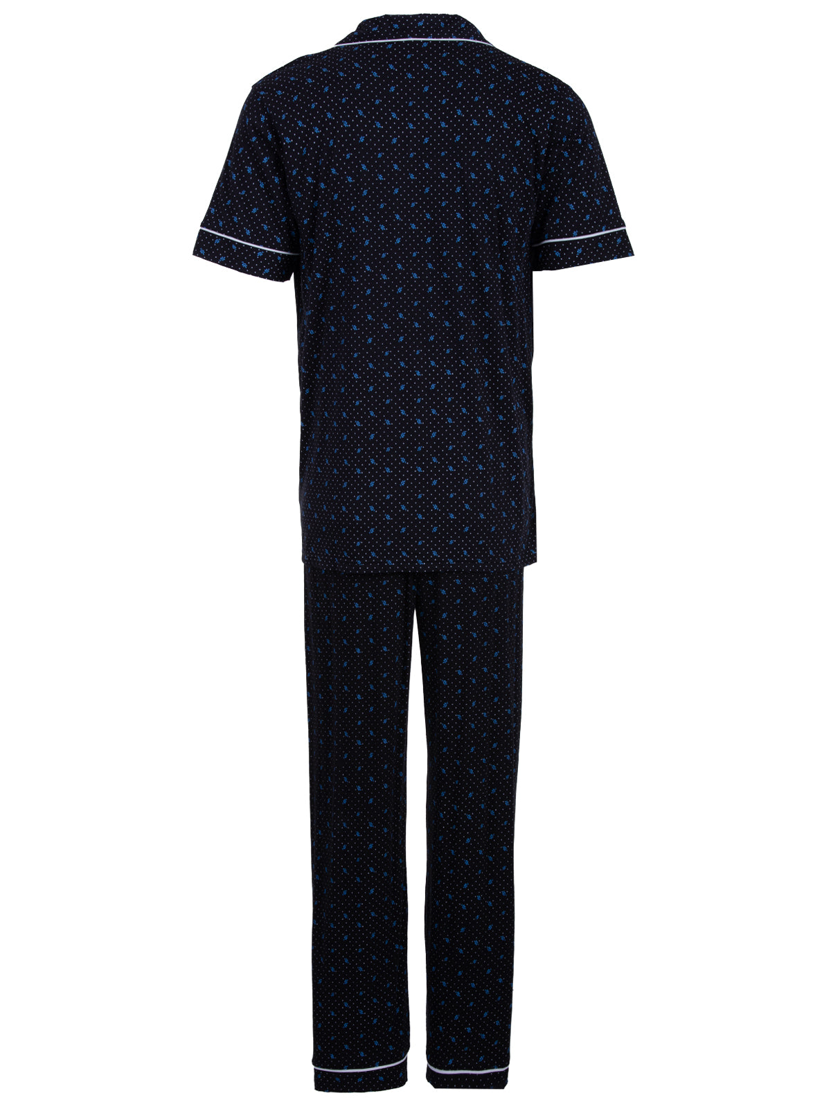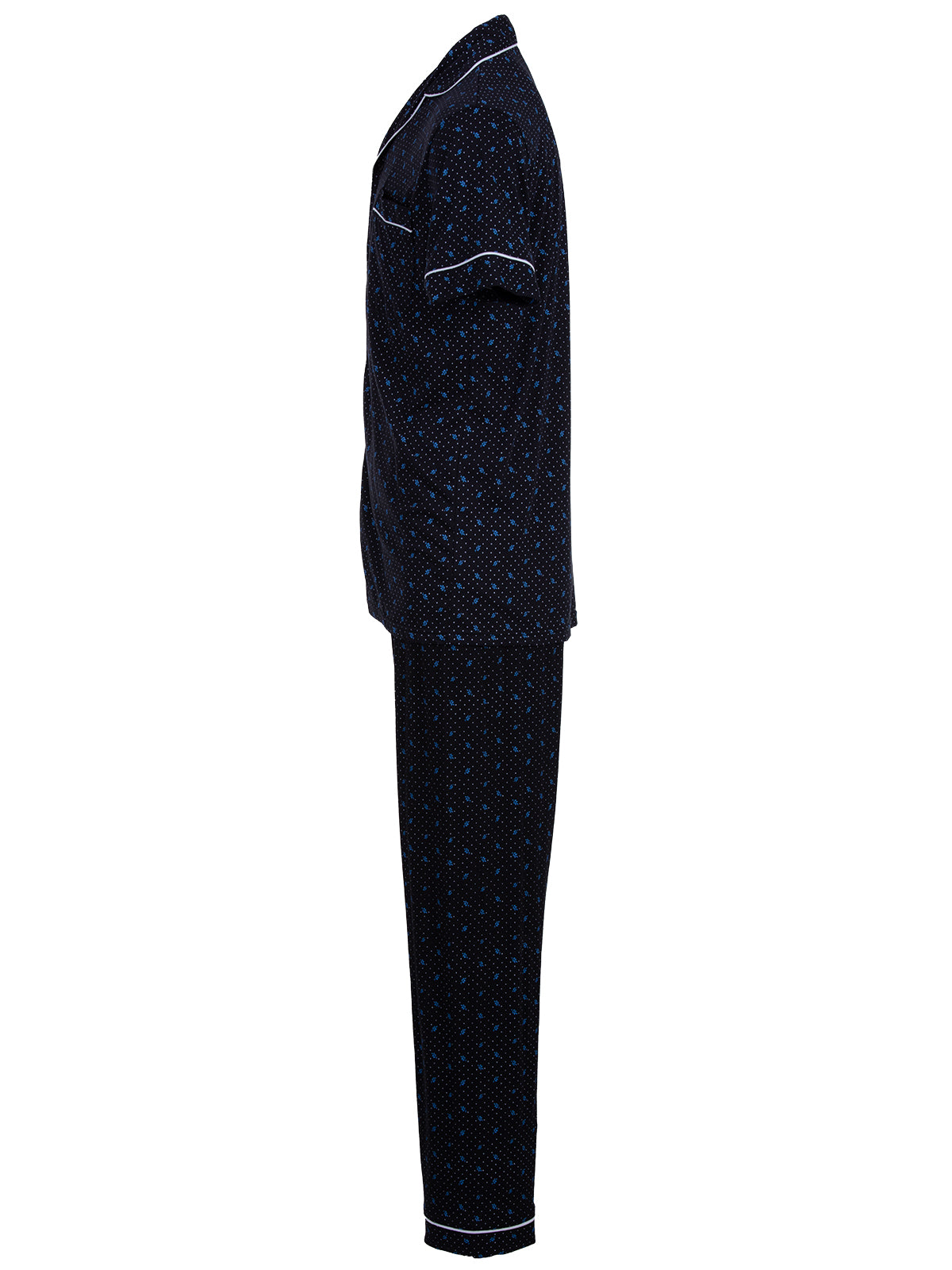 Modischer zeitloser Schlafanzug. Der Herrenschlafanzug ist angenehm auf der Haut zu tragen. Brusttasche auf dem Oberteil. Oberteil durchgeknöpft. Die lange Schlafanzughose hat einen Dehnbund.