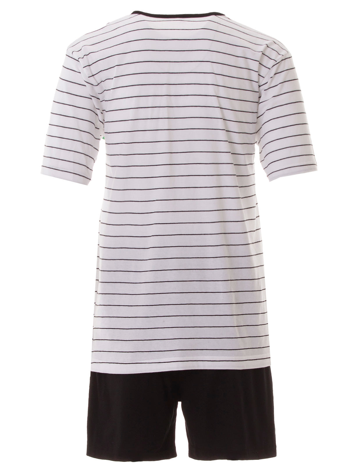 Dekorativer zeitloser Schlafanzug. Der Herrenschlafanzug ist angenehm auf der Haut zu tragen und hat einen V-Ausschnitt. Die kurze Schlafanzughose hat einen Dehnbund.