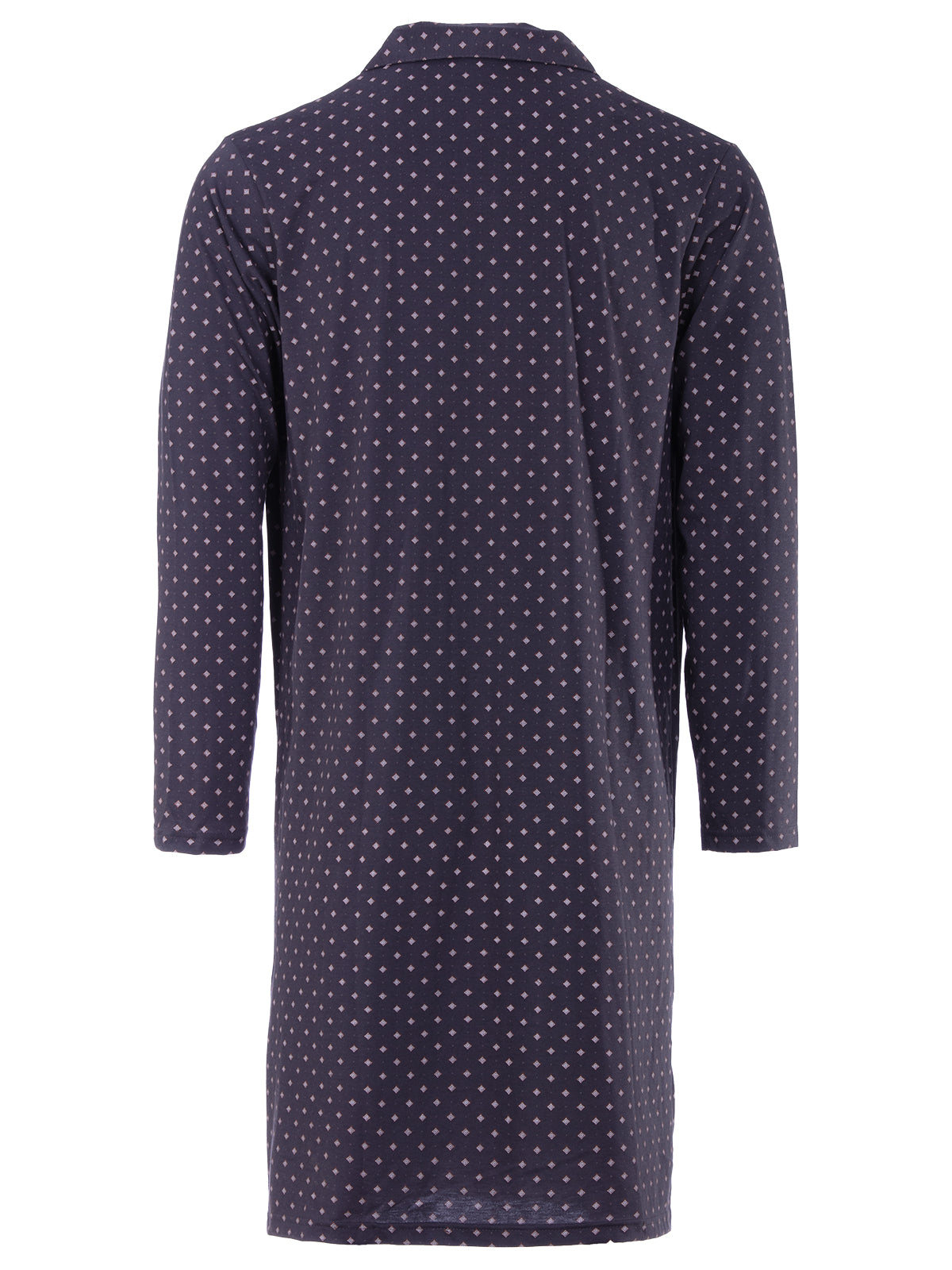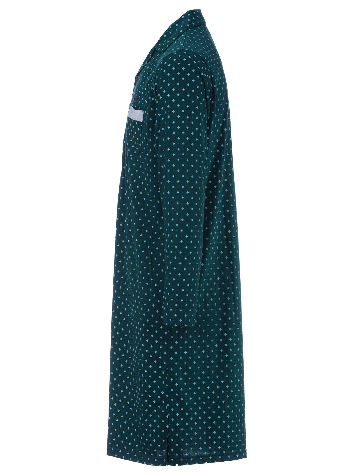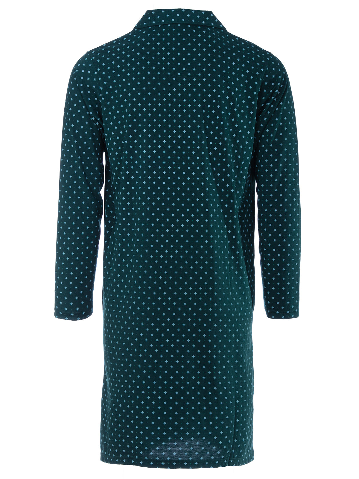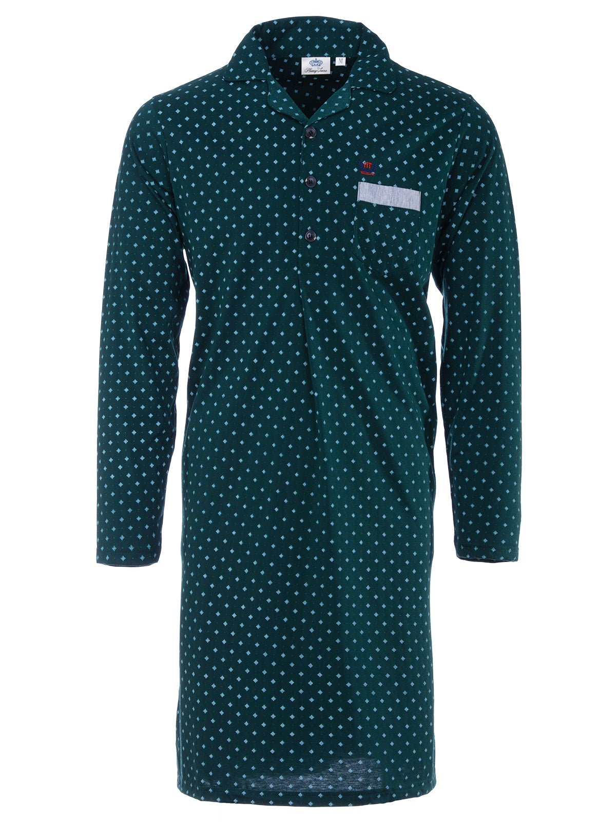 Das Schlafshirt ist in den Farben grün, navy und anthrazit erhältlich. Ein Muster aus dezenten Rauten und Punkten lockert das Design optisch auf.