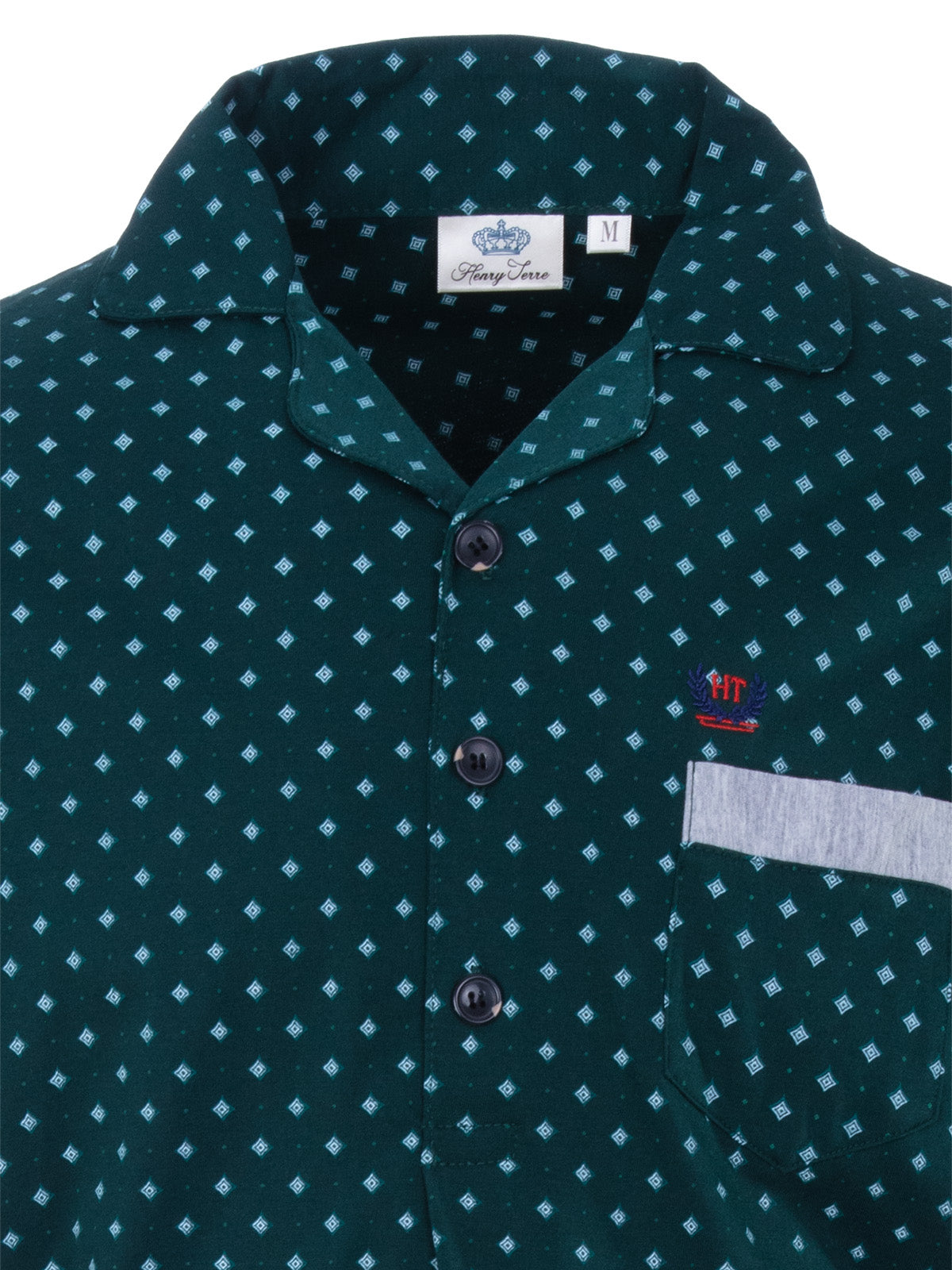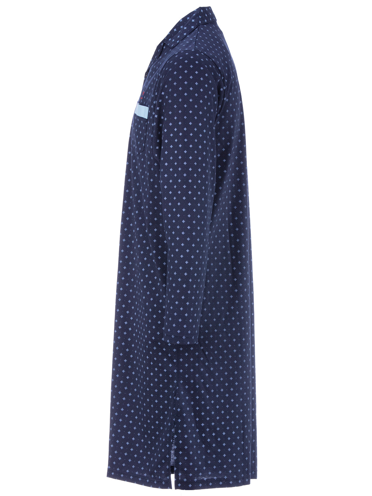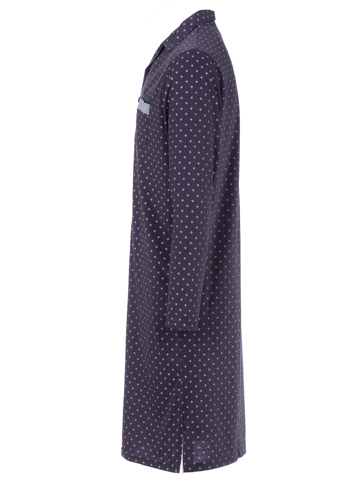 Das Schlafshirt ist in den Farben grün, navy und anthrazit erhältlich. Ein Muster aus dezenten Rauten und Punkten lockert das Design optisch auf.