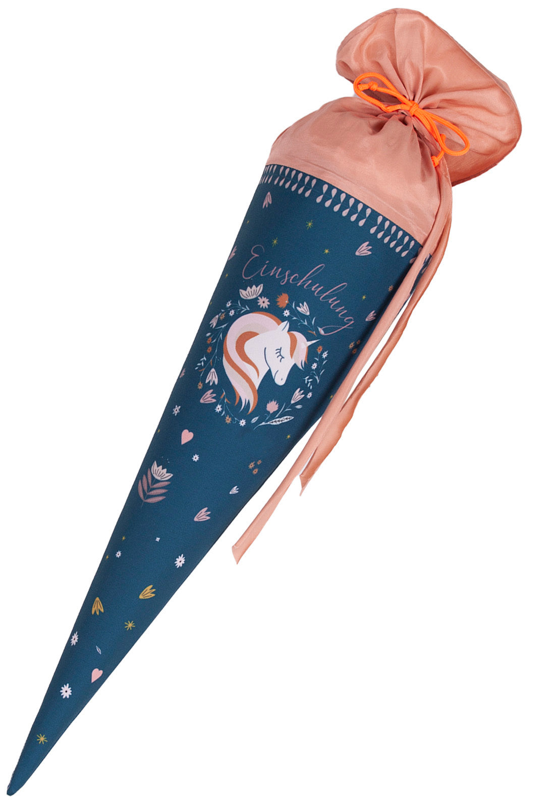 Diese liebevoll gestaltete Schultüte begeistert kleine Schulanfängerinnen mit einem traumhaften Einhorn-Motiv, das liebevoll gezeichnet ist. Auf dem navyblauen Hintergrund kommt das Einhorn besonders schön zur Geltung.