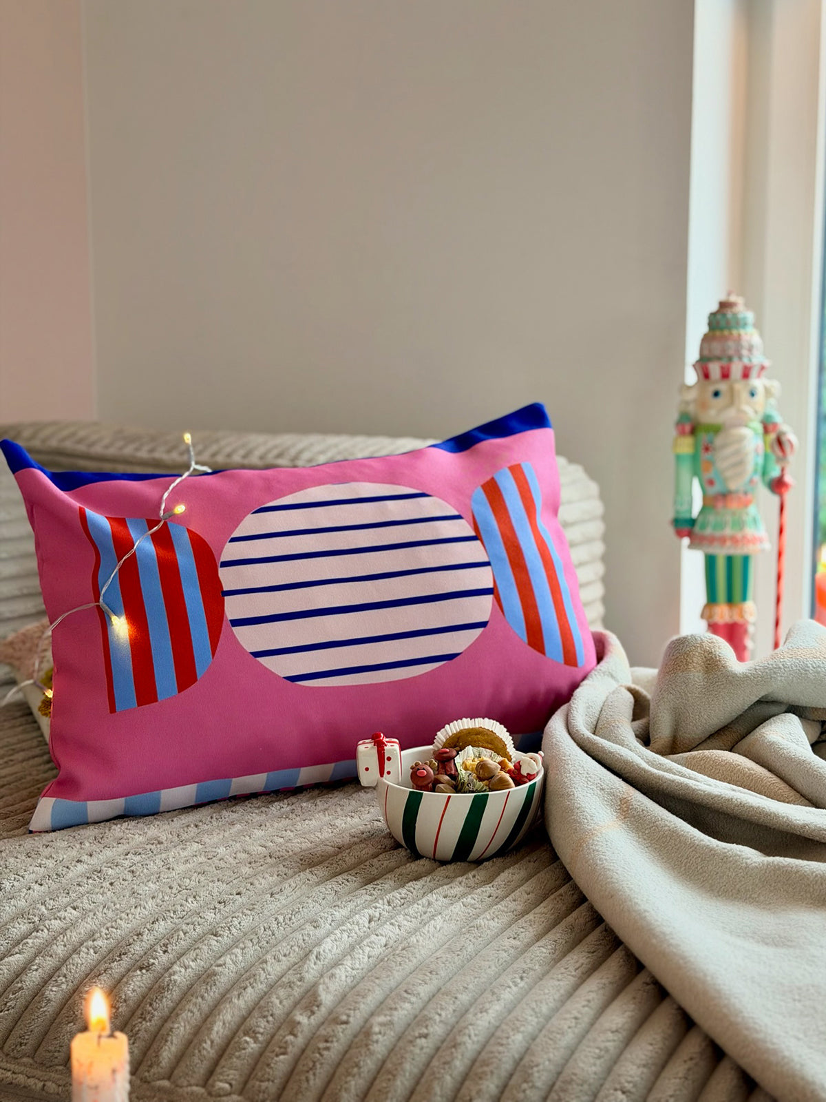Frische Farben, modernes Design: Unser pinker Kissenbezug mit großem Bonbon in rosé/blauen Streifen bringt sofort Weihnachtslaune in dein Zuhause.