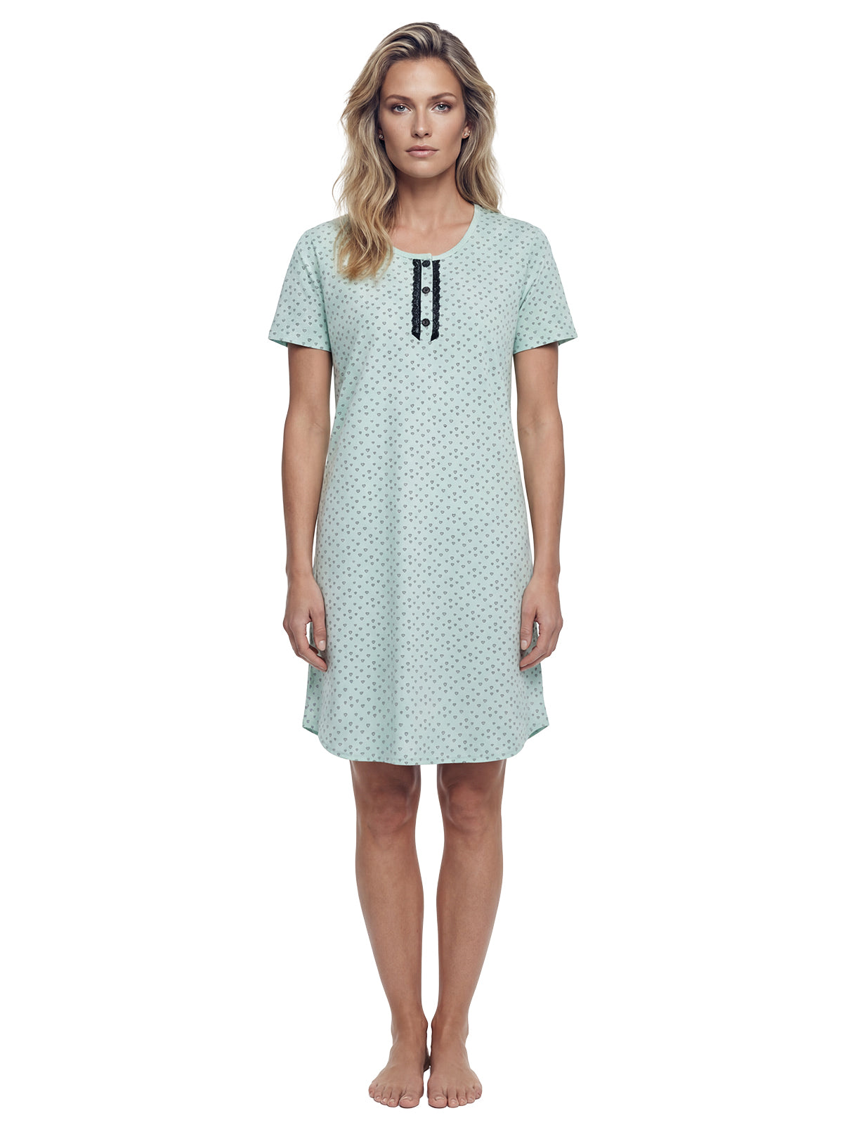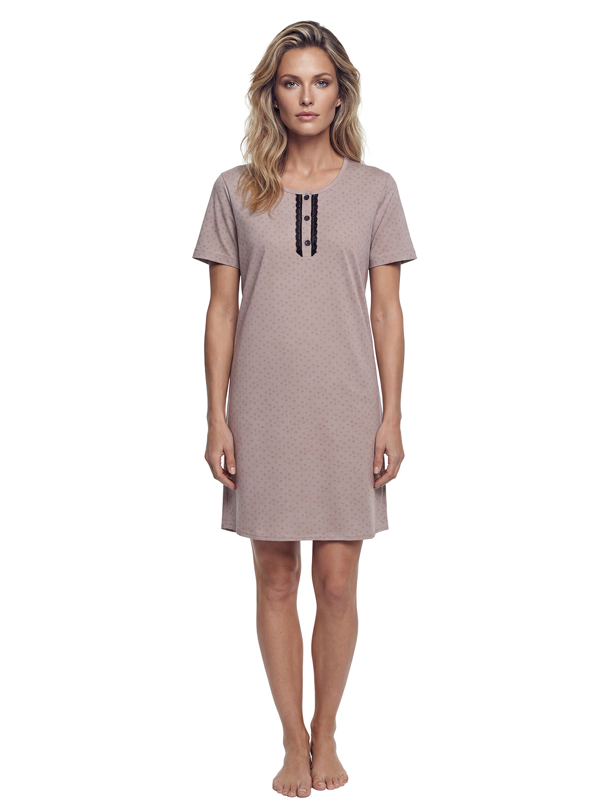 Mit kurzen Ärmeln und Spitze am Ausschnitt kombiniert es klassische Elemente mit modernem Design. Die kleine Knopfleiste ermöglicht ein einfaches An- und Ausziehen und verleiht dem Nachthemd einen zusätzlichen Hauch von Raffinesse.
