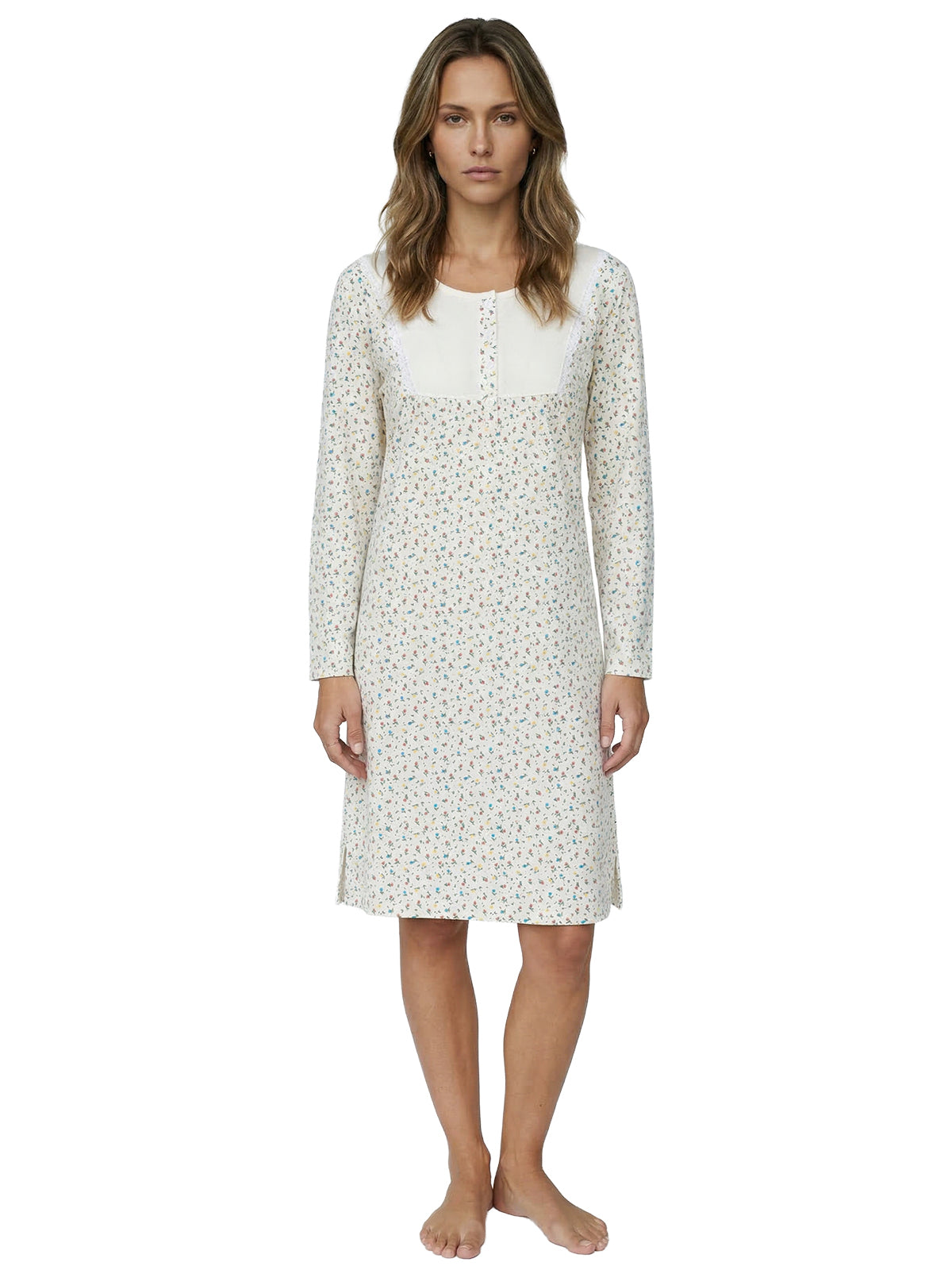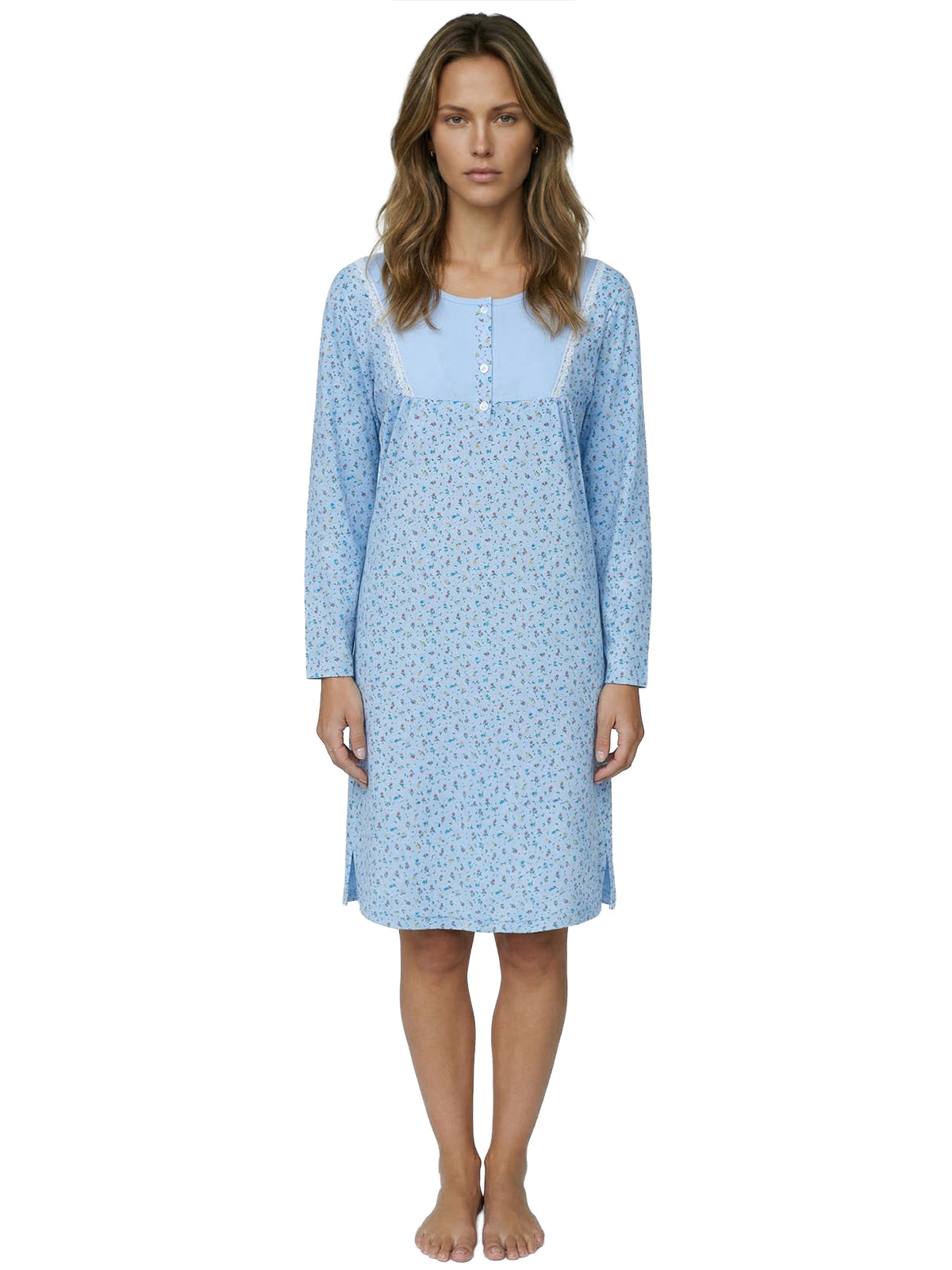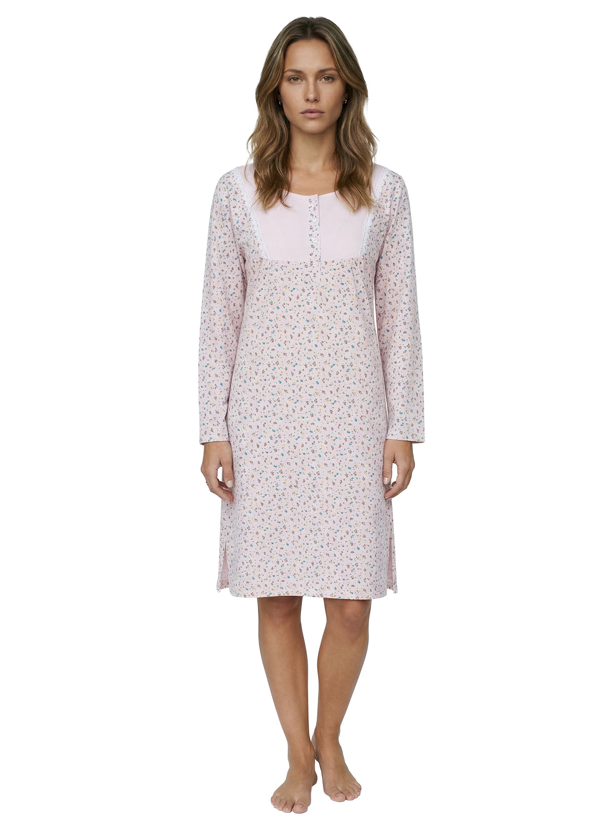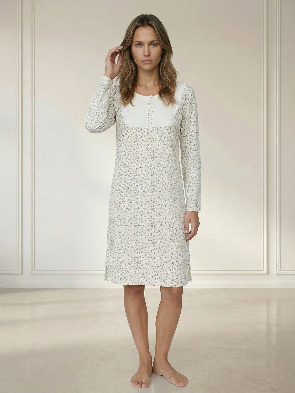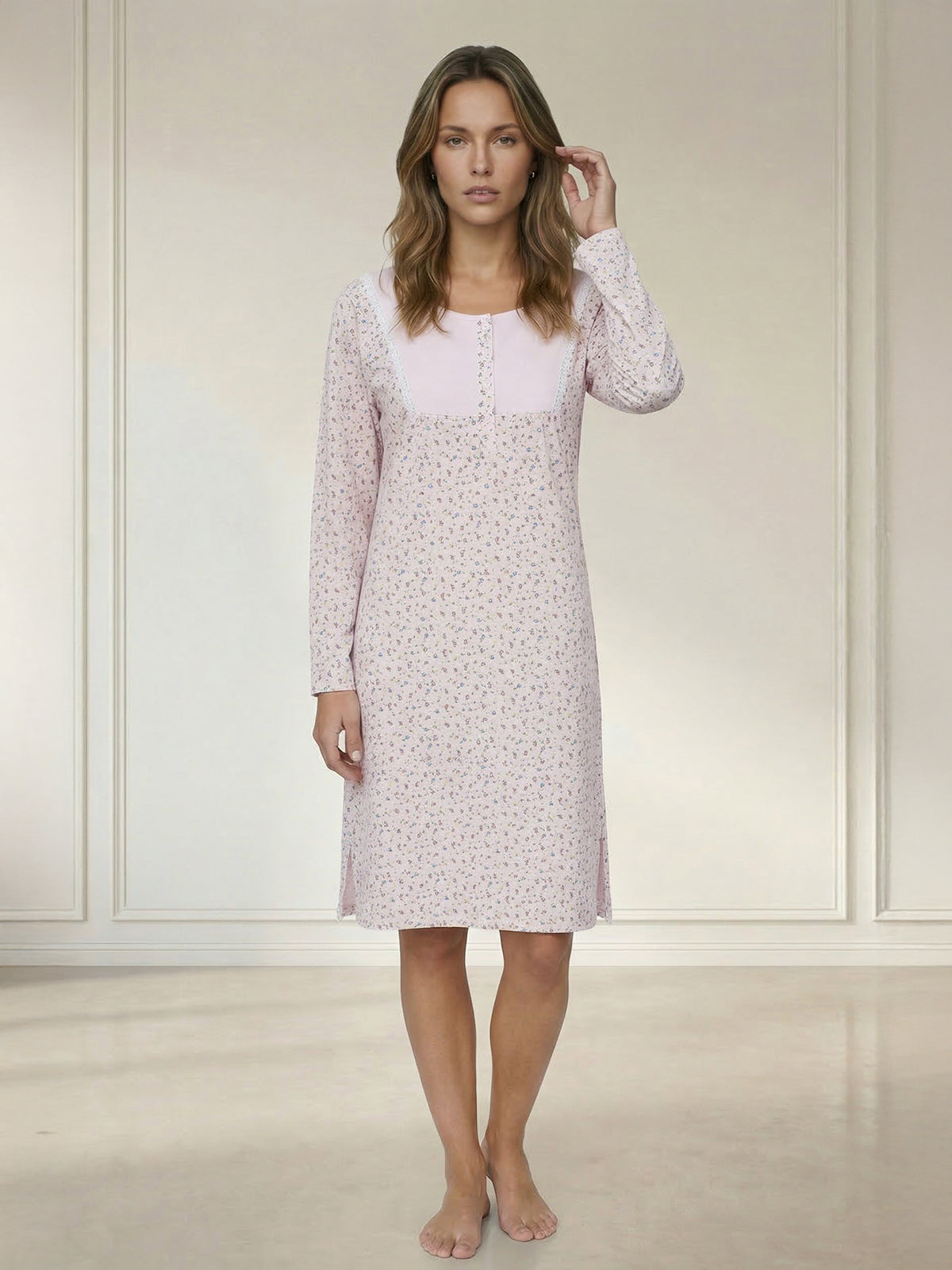Mit langen Ärmeln und der Spitze an der Brust kombiniert es klassische Elemente mit modernem Design. Die kleine Knopfleiste ermöglicht ein einfaches An- und Ausziehen und verleiht dem Nachthemd einen zusätzlichen Hauch von Raffinesse.