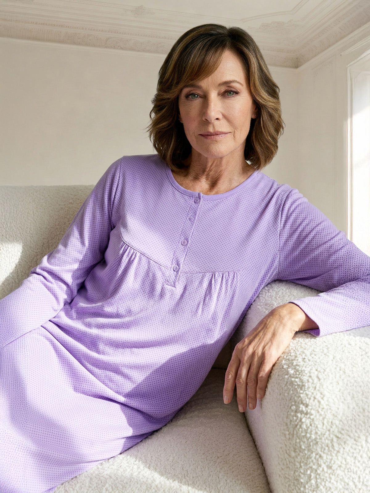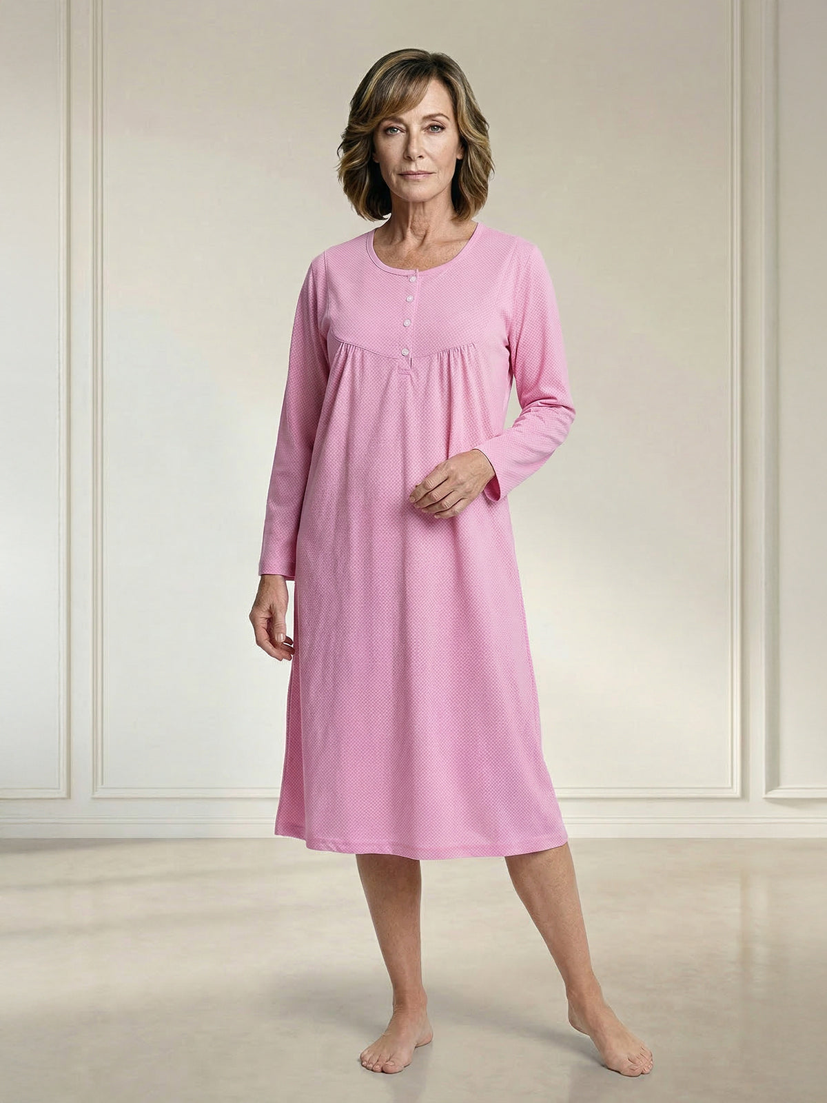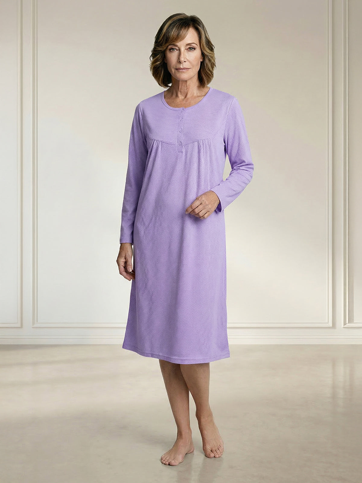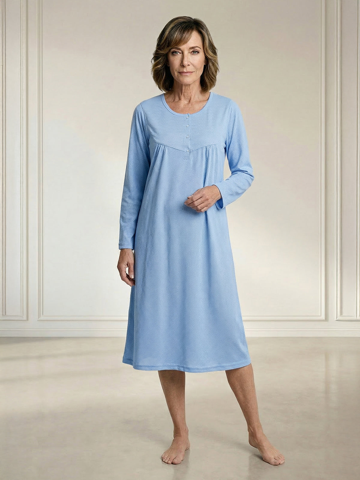 Mit langen Ärmeln und kleiner Raffung kombiniert es klassische Elemente mit modernem Design. Die kleine Knopfleiste ermöglicht ein einfaches An- und Ausziehen und verleiht dem Nachthemd einen zusätzlichen Hauch von Raffinesse.
