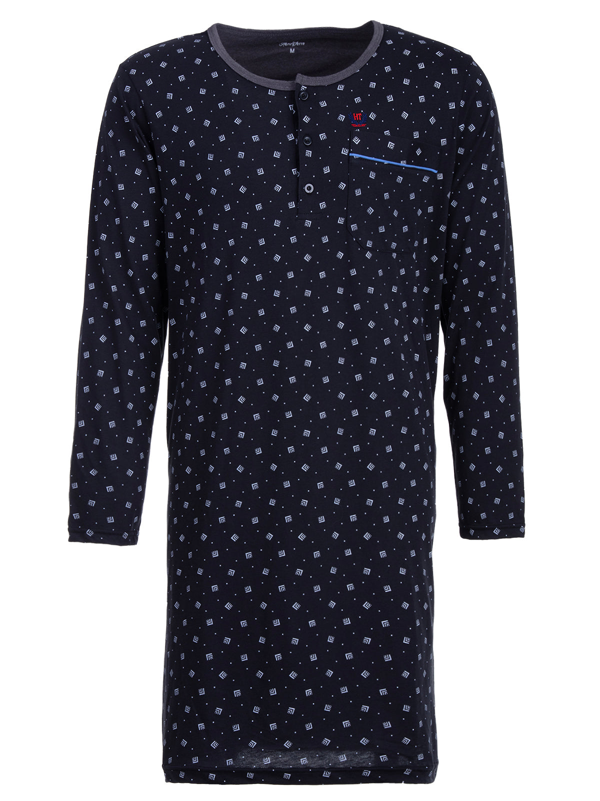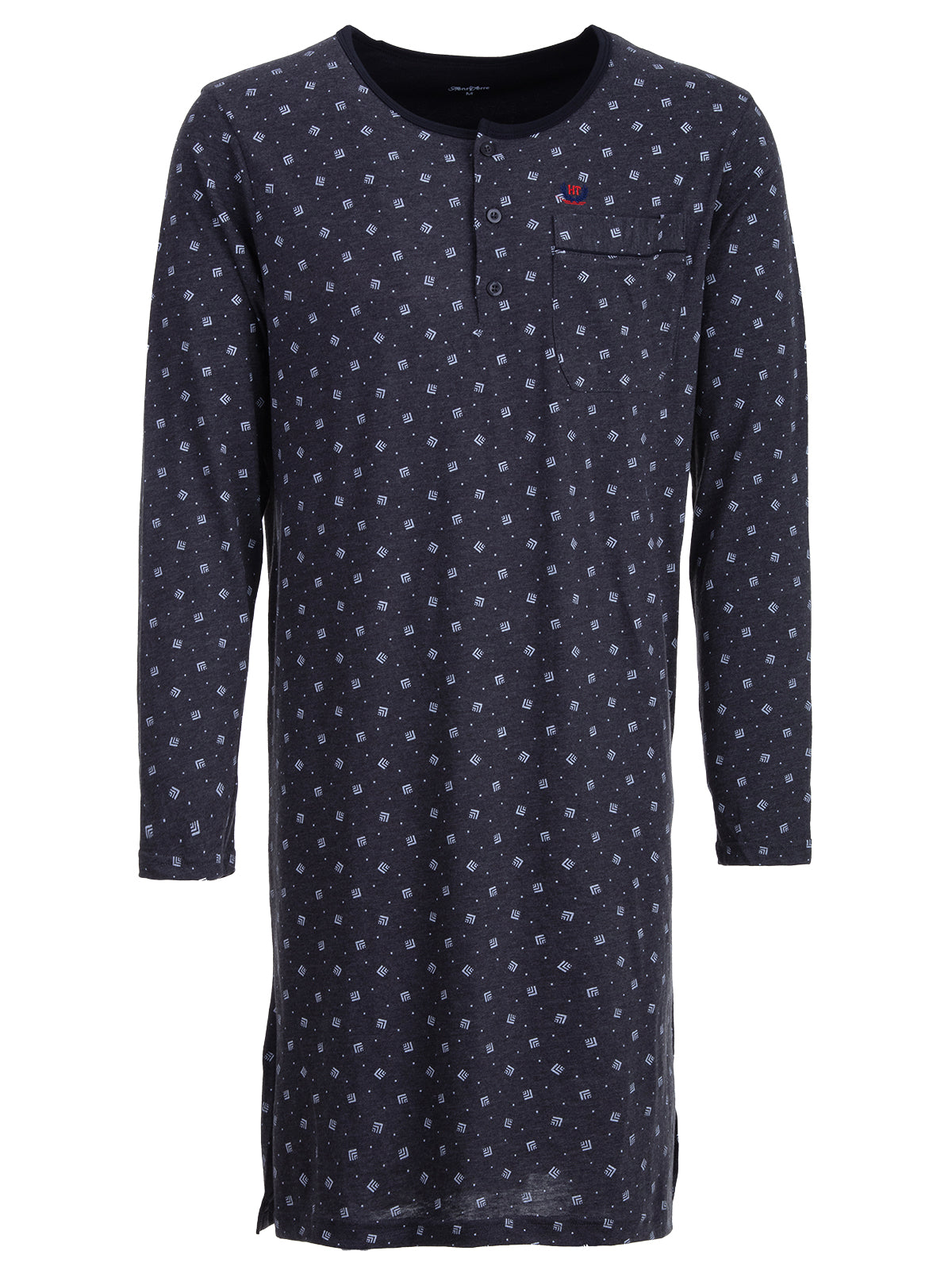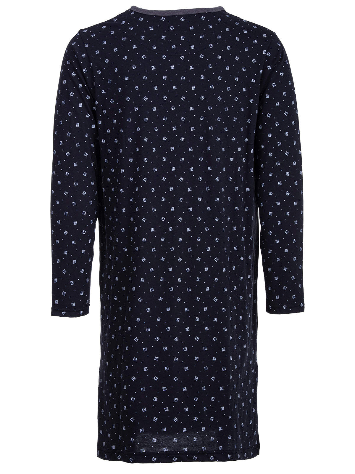 Dieses langärmelige Herren-Nachthemd ist die perfekte Kombination aus hohem Tragekomfort und einem klassischen Design- ein Mix aus Sqares mit Punkten. Dekorative Knopfleiste und Brusttasche. Wunderbar weich und gleichzeitig formbeständig. Die seitlichen Schlitze machen das Nachthemd besonders bequem. Ideal für Herren, die entspannte Nächte am liebsten in bewährter Henry Terre Qualität genießen.