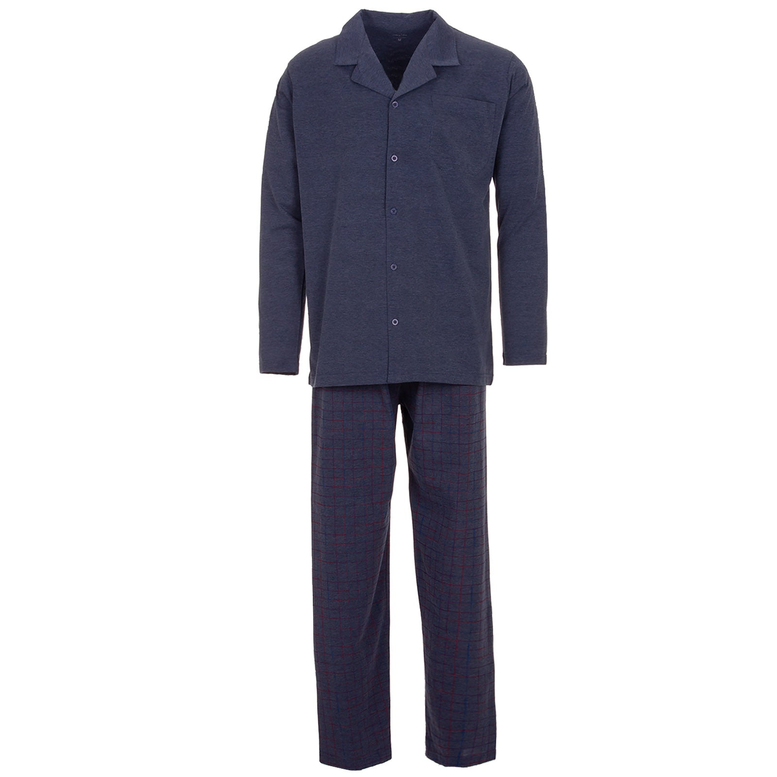 Dekorativer zeitloser Schlafanzug. Der Herrenschlafanzug ist angenehm auf der Haut zu tragen. Brusttasche auf dem Oberteil. Oberteil durchgeknöpft. Die Schlafanzughose hat einen Dehnbund.