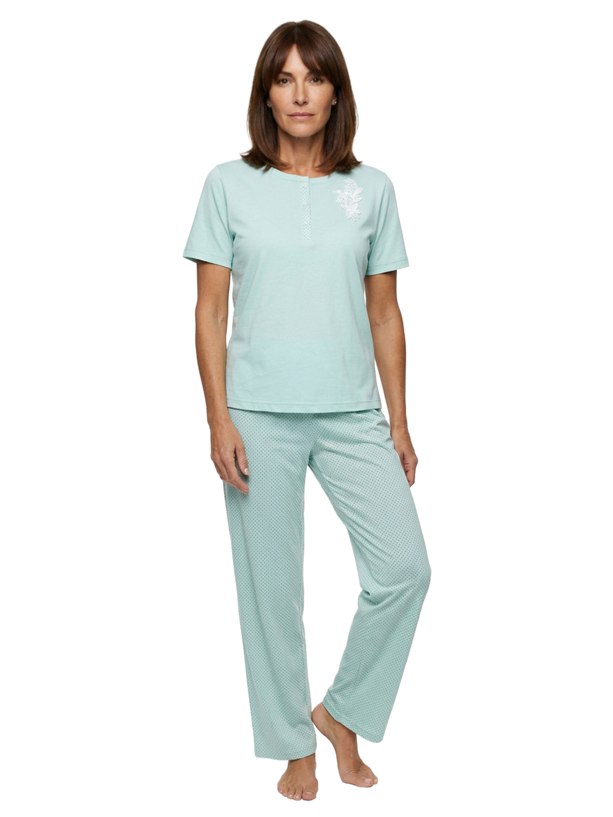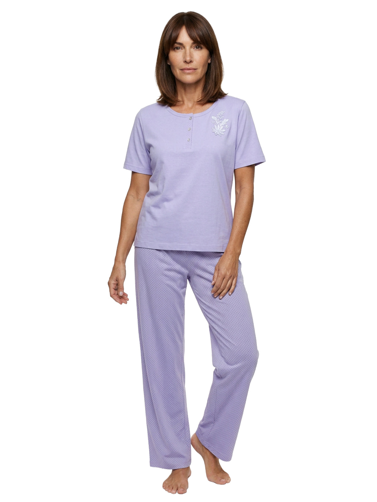 Der Pyjama aus weichem, fein fließenden Single-Jersey fühlt sich angenehm auf der Haut an. Der Hosen Allover-Druck besteht aus kleinen Punkten, die farblich abgesetzt sind.