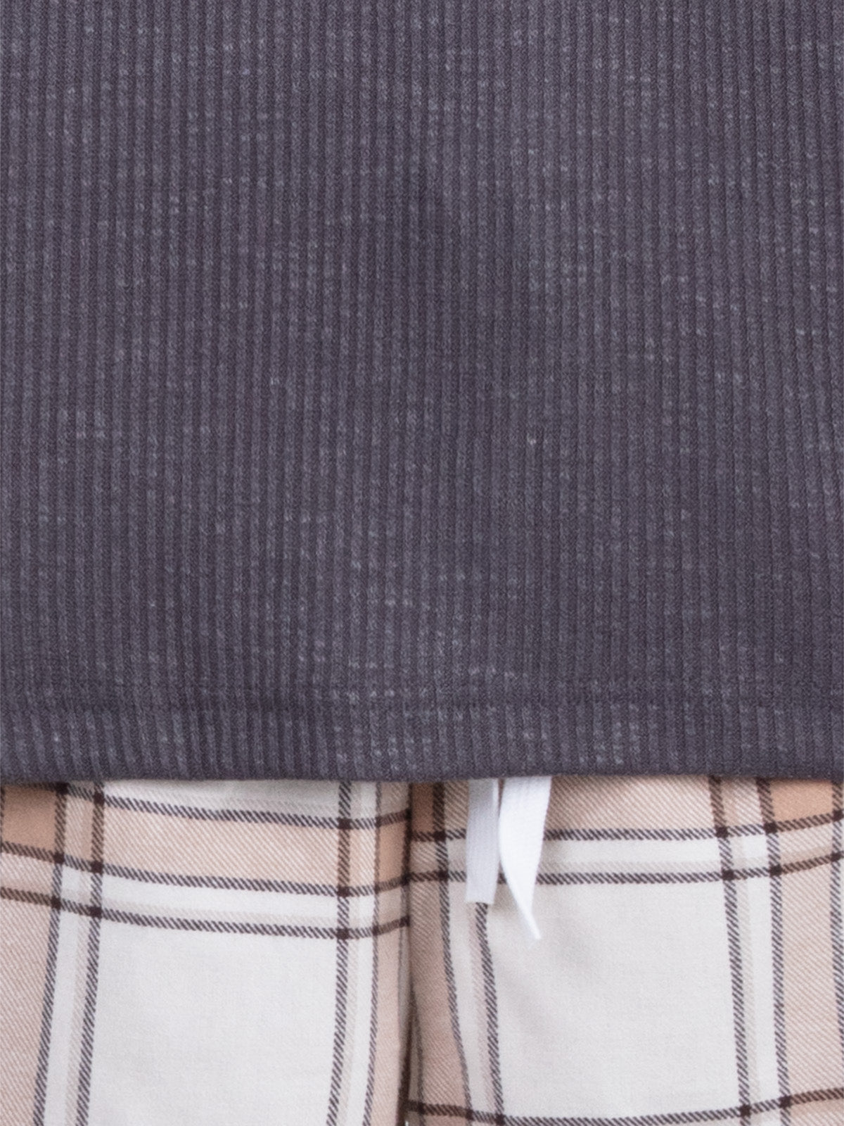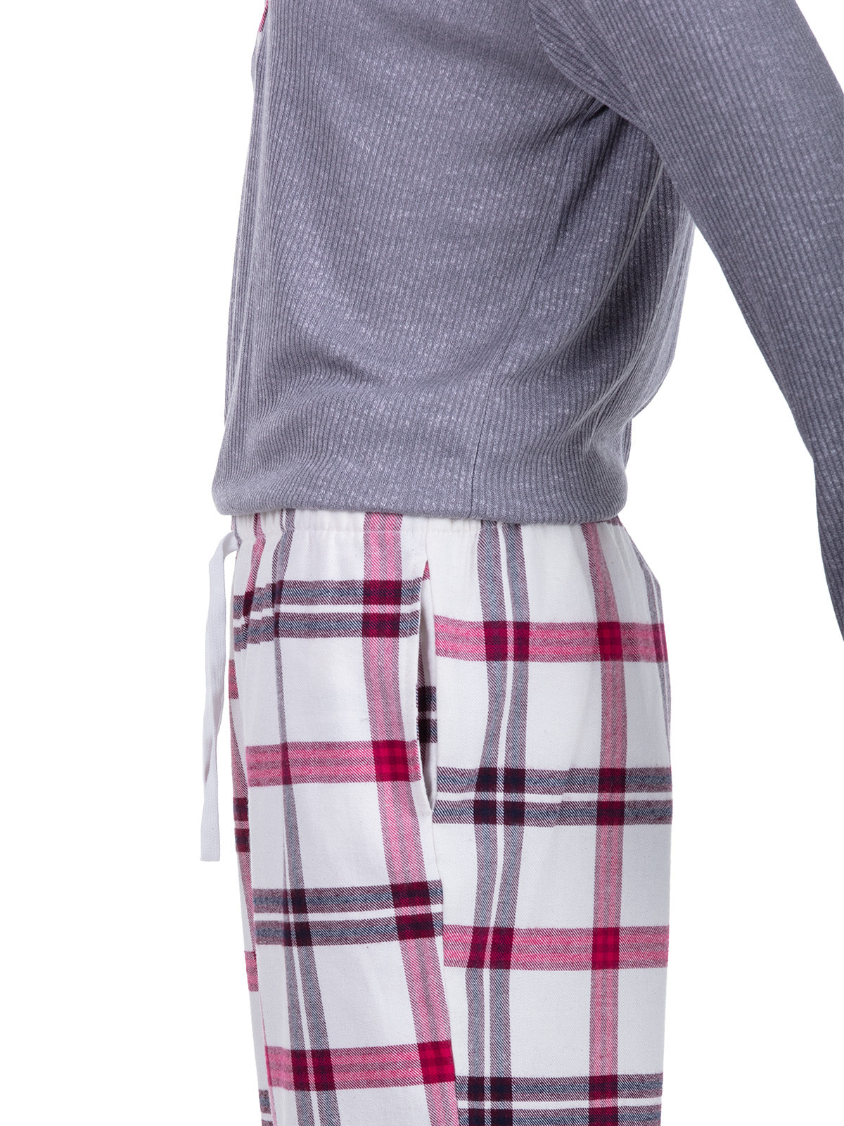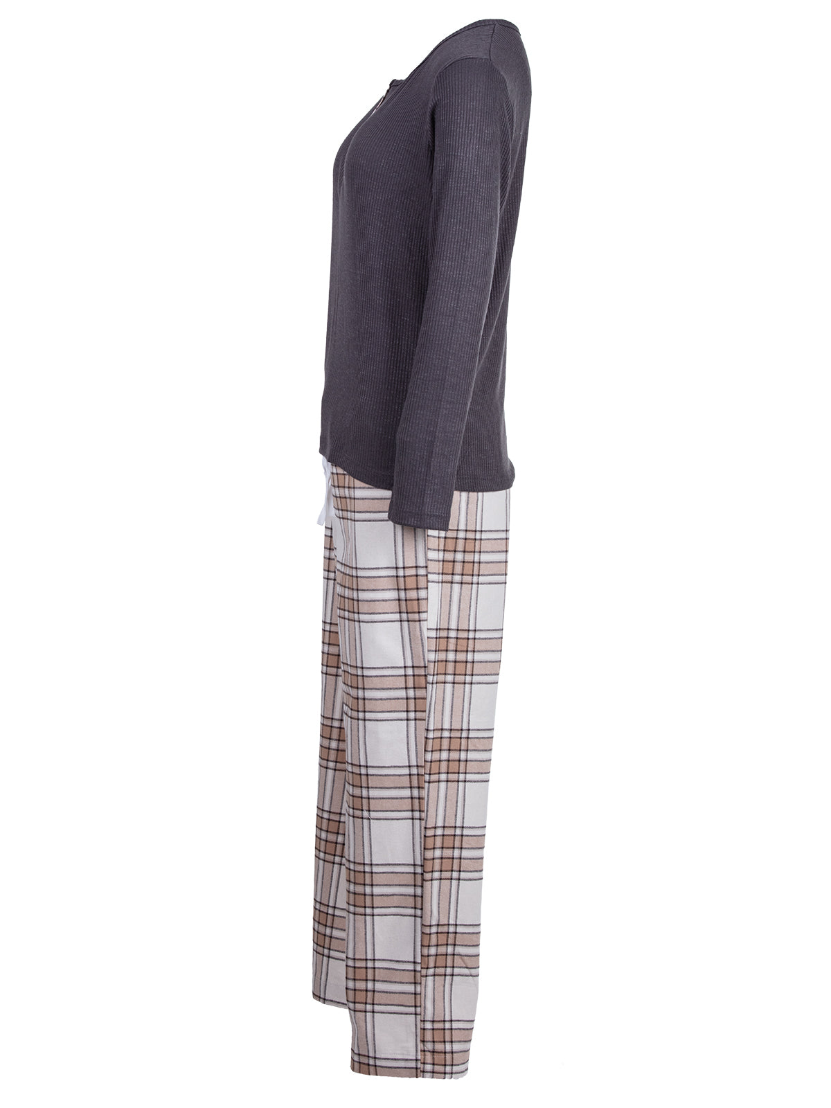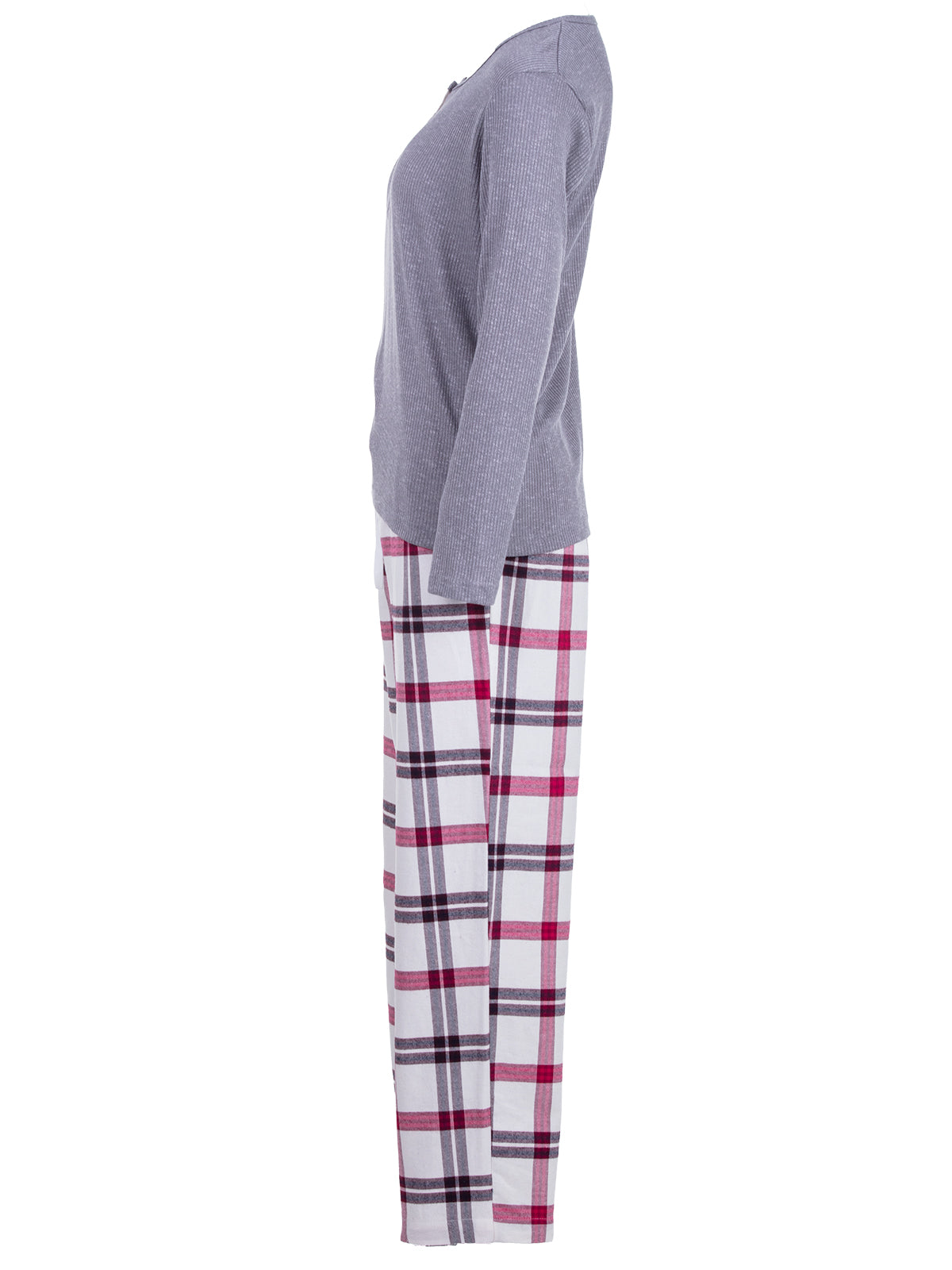 Die Hose in wechselnden Karo-Designs mit Dehnbund und seitlichen Taschen. Das Oberteil mit Rundhalsausschnitt und farblich passender Knopfleiste.