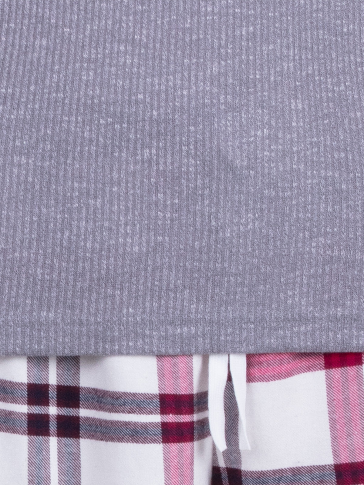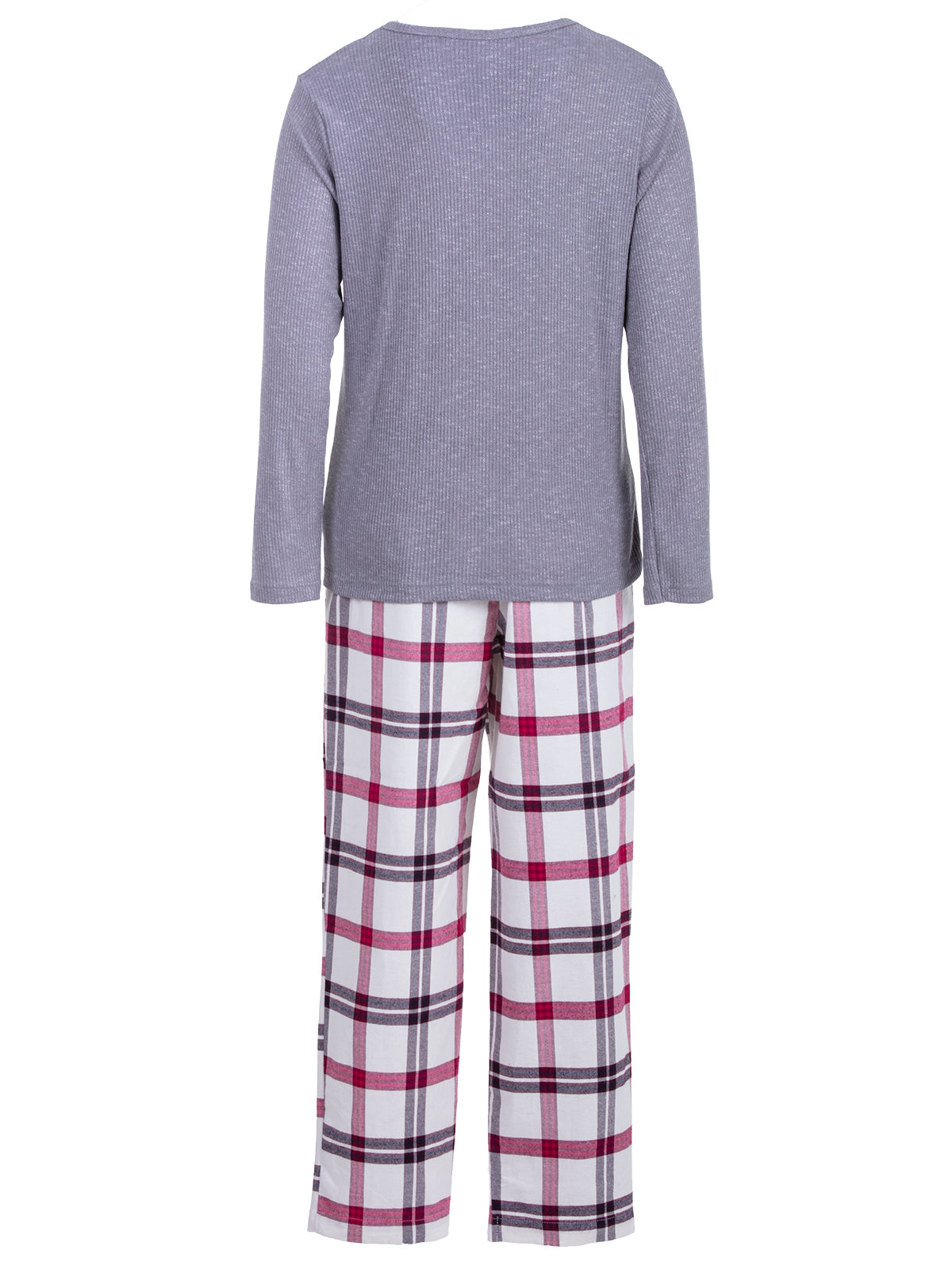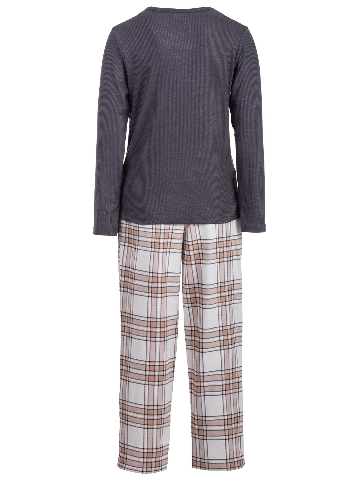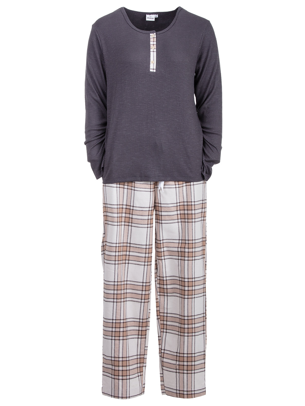 Die Hose in wechselnden Karo-Designs mit Dehnbund und seitlichen Taschen. Das Oberteil mit Rundhalsausschnitt und farblich passender Knopfleiste.