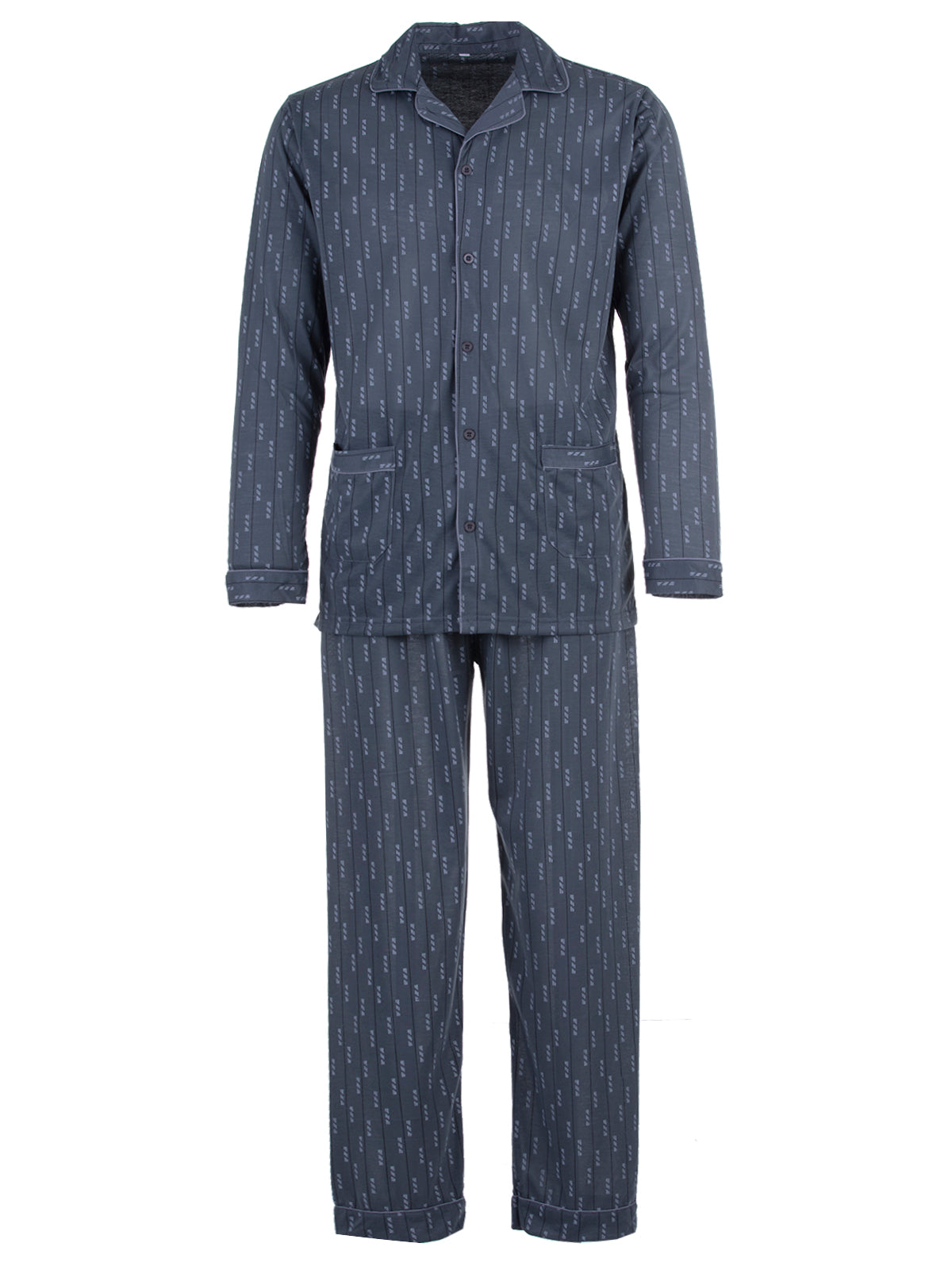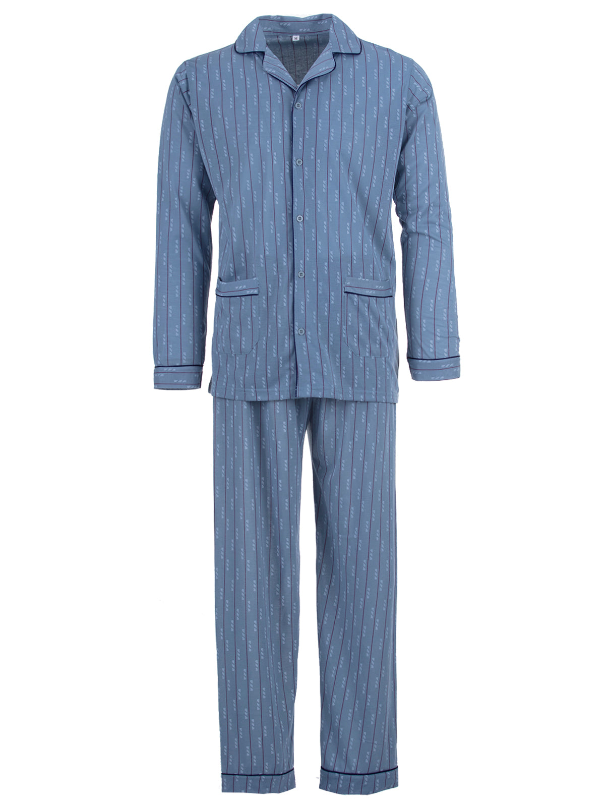 Dekorativer klassischer Schlafanzug. Der Herrenschlafanzug ist angenehm auf der Haut zu tragen. V-Ausschnitt mit Kragen, Brusttasche und Knopfleiste. Die Schlafanzughose hat einen Dehnbund.