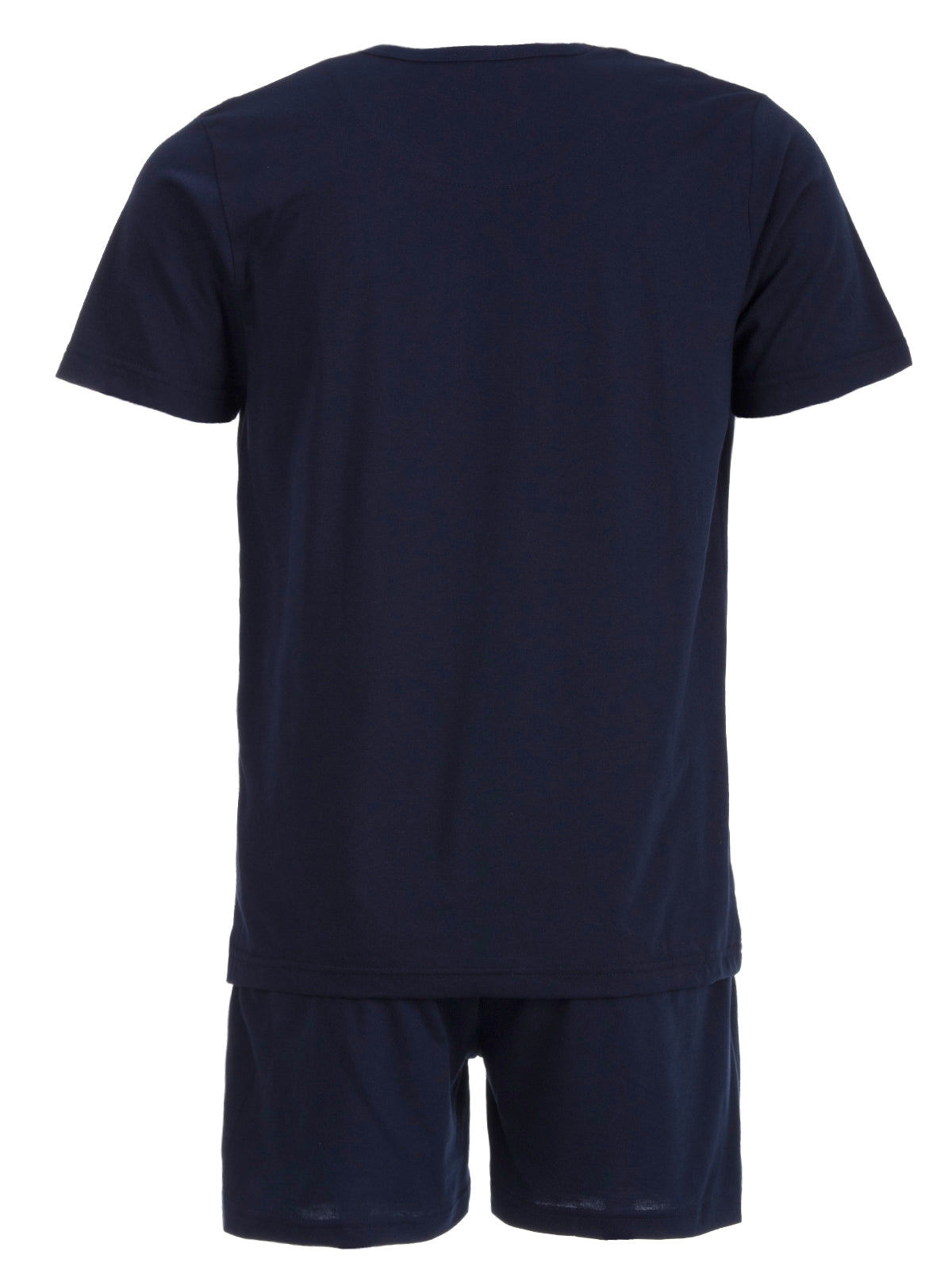 Modischer zeitloser Schlafanzug. Der Herrenschlafanzug ist angenehm auf der Haut zu tragen. Rundhalsausschnitt mit modernem Print. Die kurze unifarbene Schlafanzughose hat einen Dehnbund.
