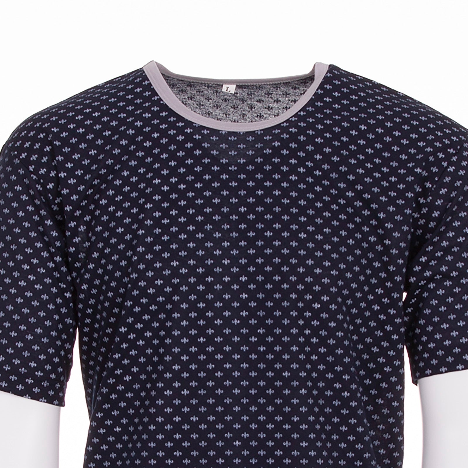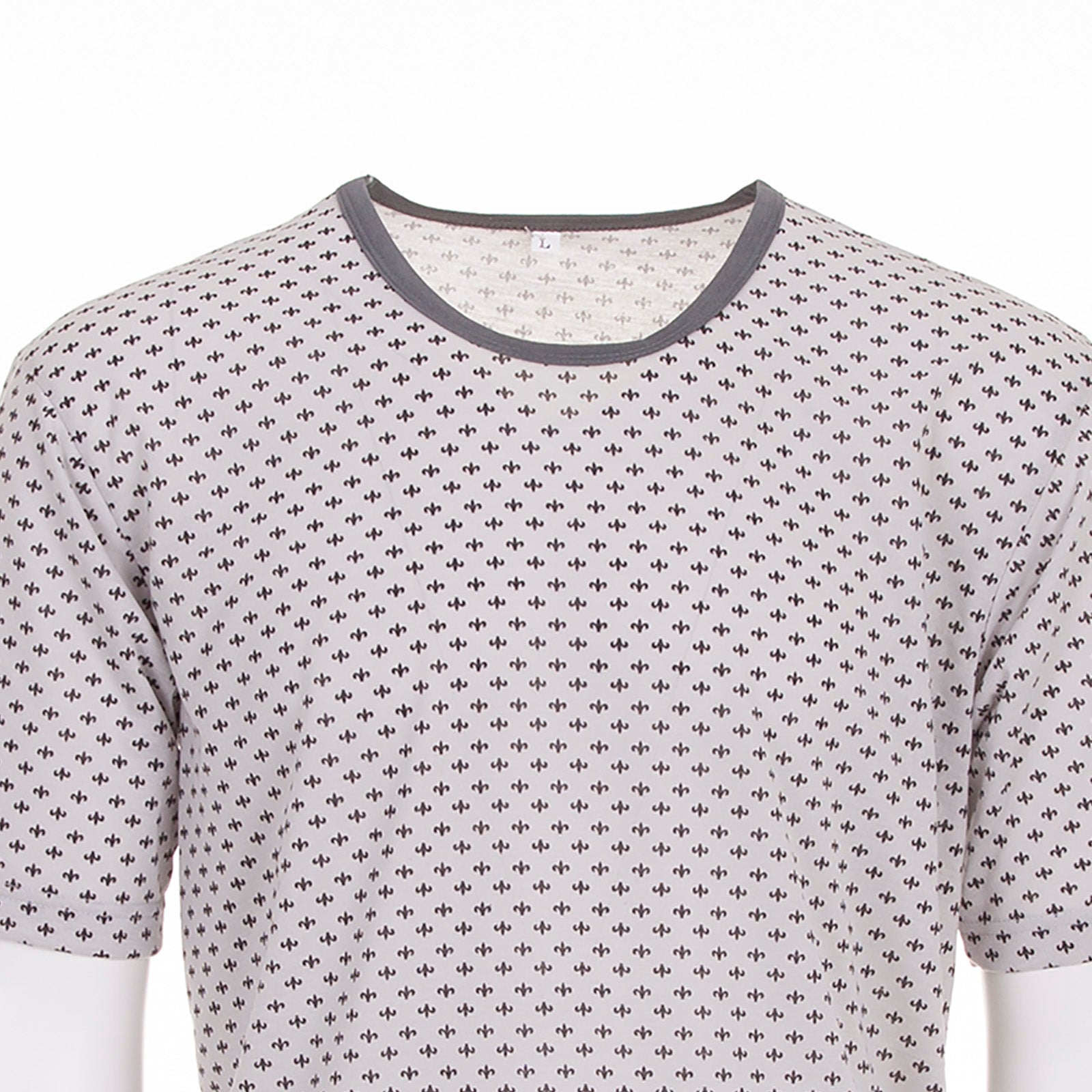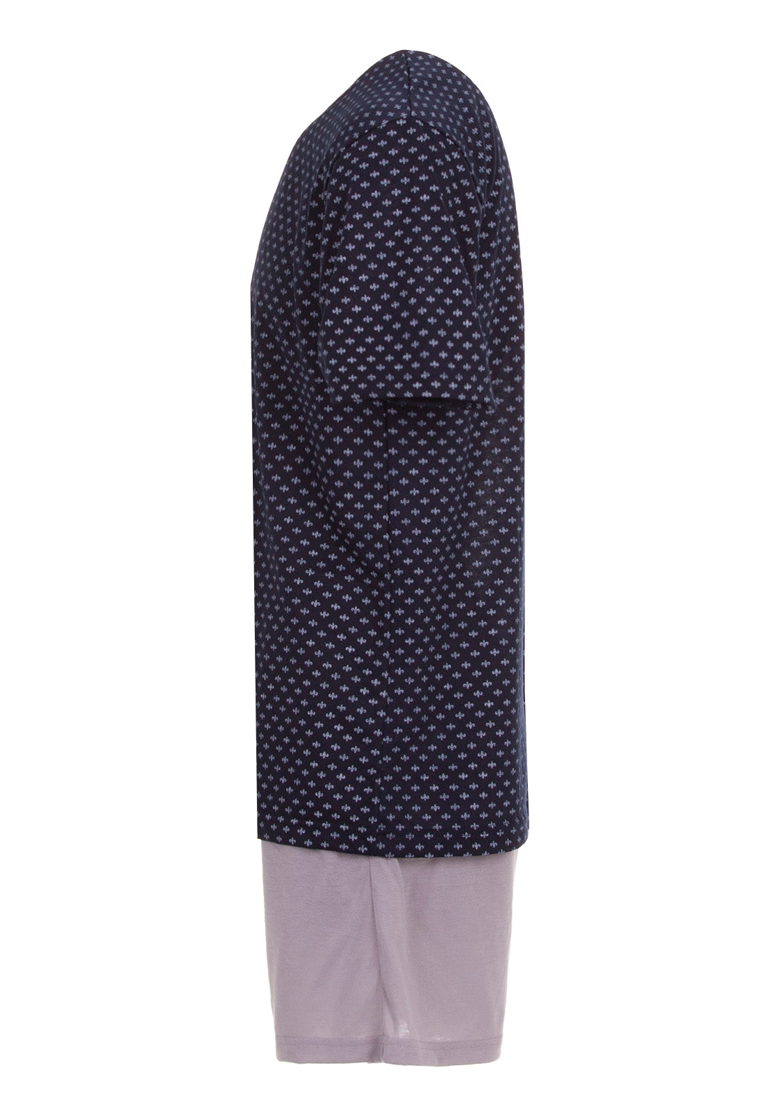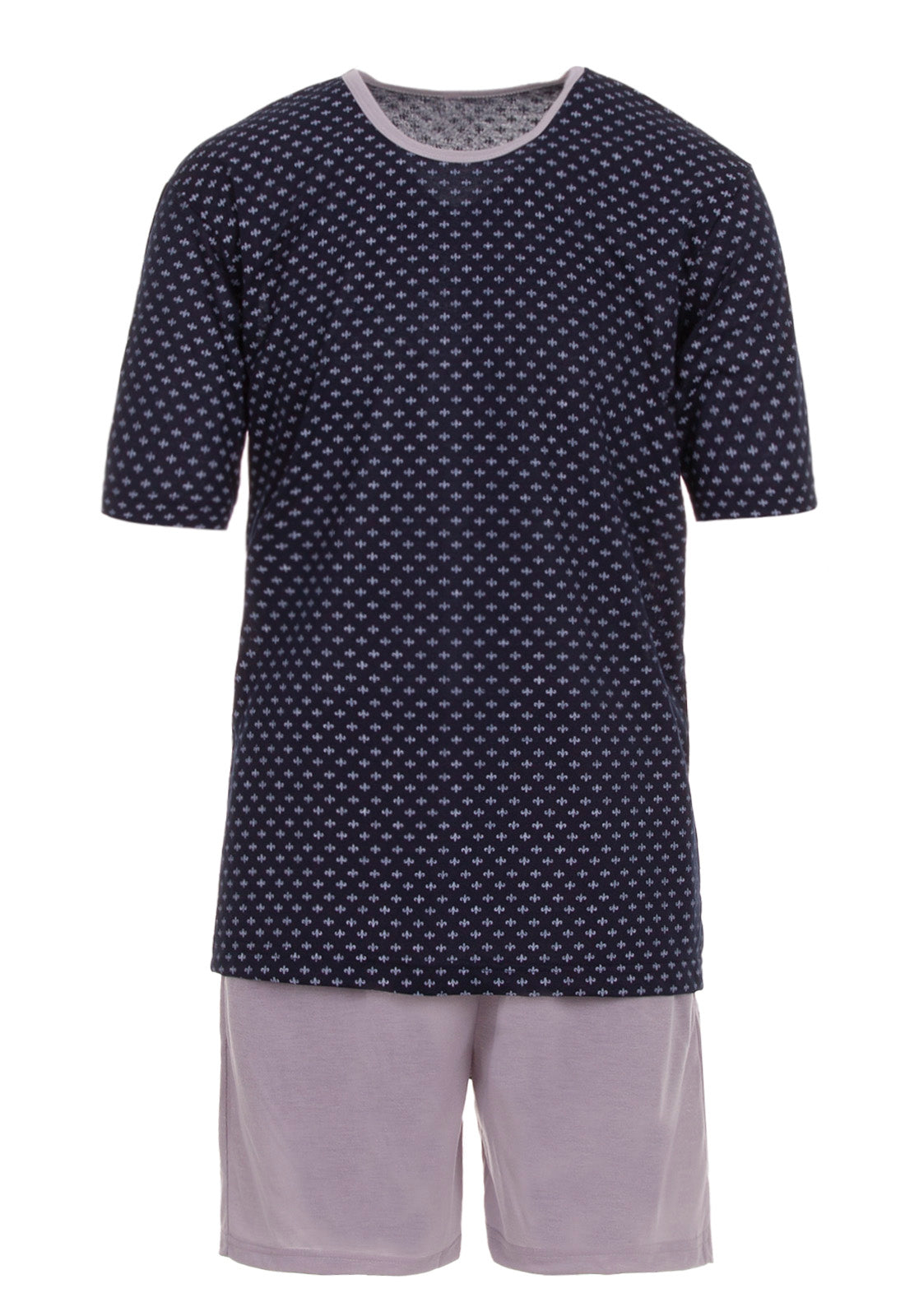 Modischer zeitloser Schlafanzug. Der Herrenschlafanzug ist angenehm auf der Haut zu tragen. Rundhalsausschnitt mit modernem Print. Die kurze unifarbene Schlafanzughose hat einen Dehnbund.