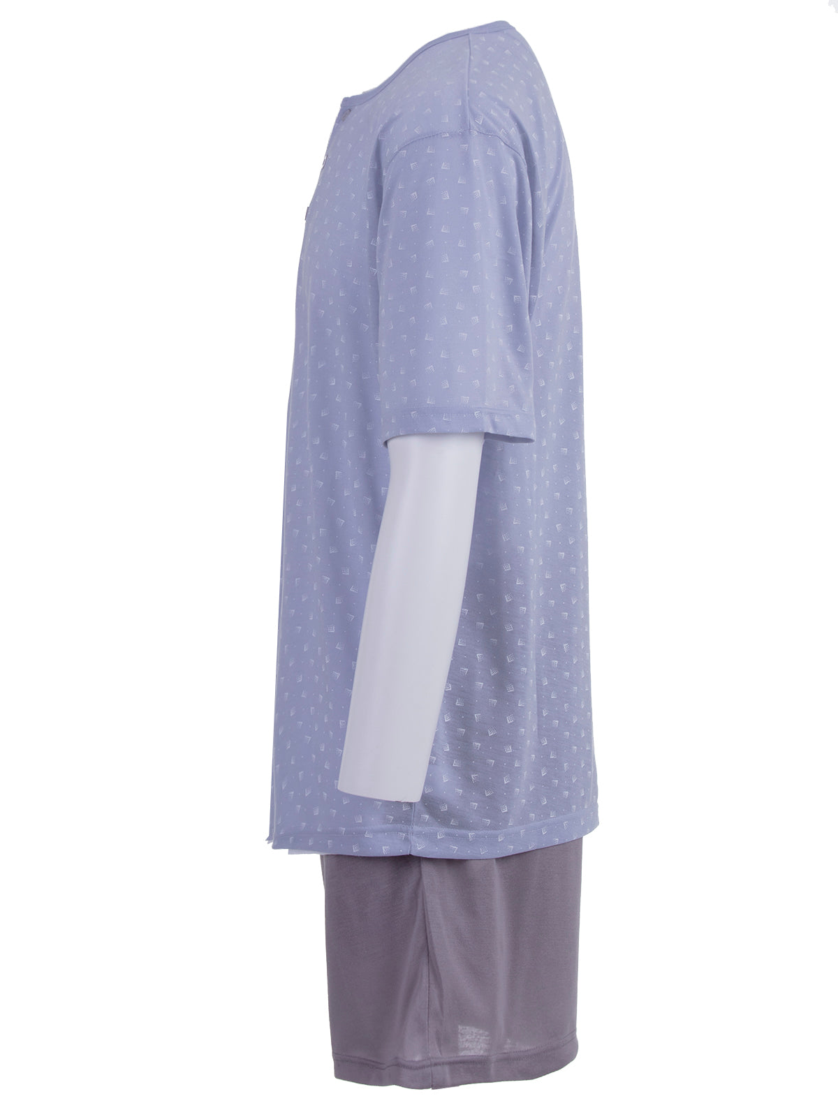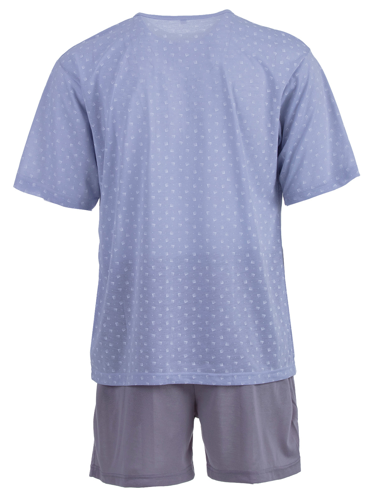 Dekorativer zeitloser Schlafanzug. Der Herrenschlafanzug ist angenehm auf der Haut zu tragen und hat einen Rundhals-Ausschnitt. Die kurze Schlafanzughose hat einen Dehnbund.