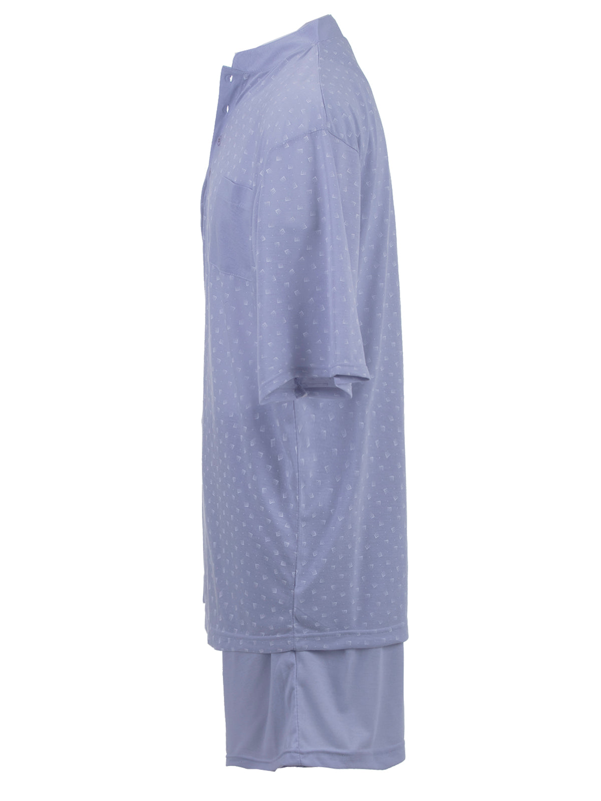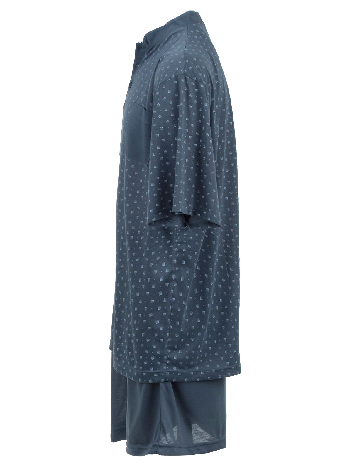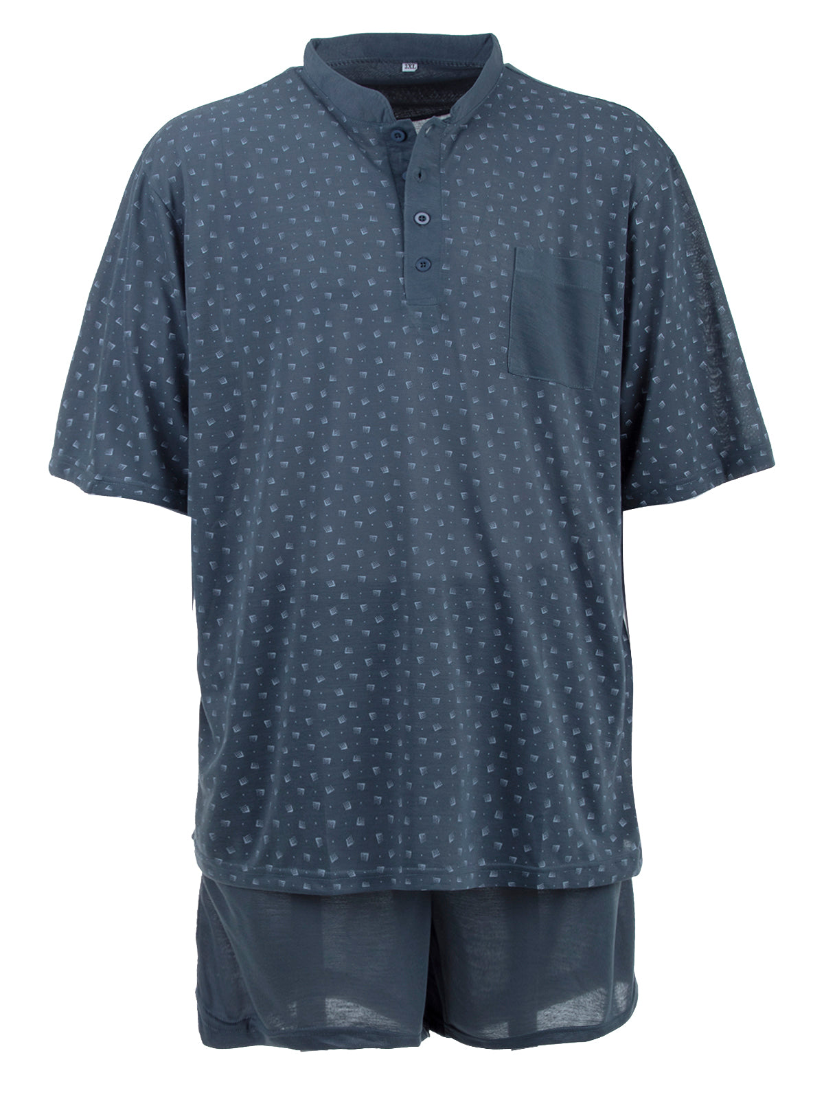 Modischer zeitloser Schlafanzug. Der Herrenschlafanzug ist angenehm auf der Haut zu tragen. V-Ausschnitt mit kleinem Stehkragen und Knopfleiste mit moderenem Print und unifarbener Brusttasche. Die kurze Schlafanzughose hat einen Dehnbund.