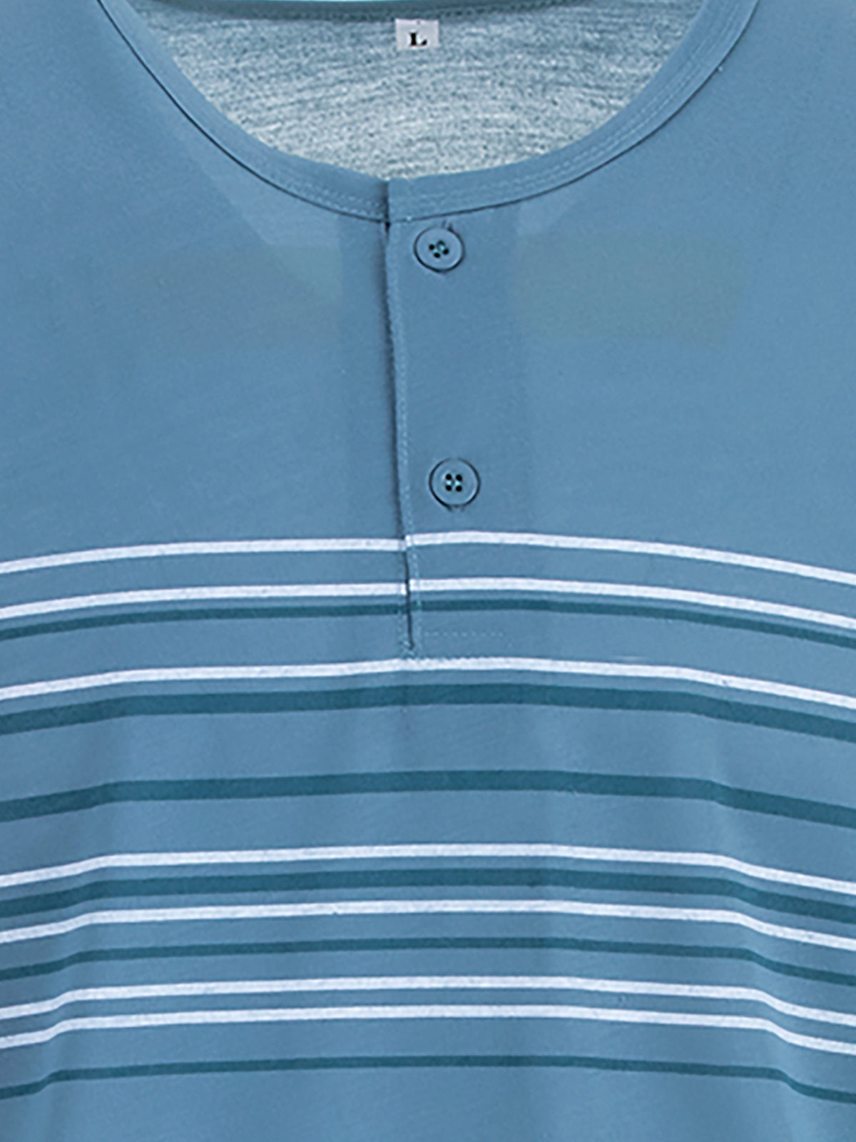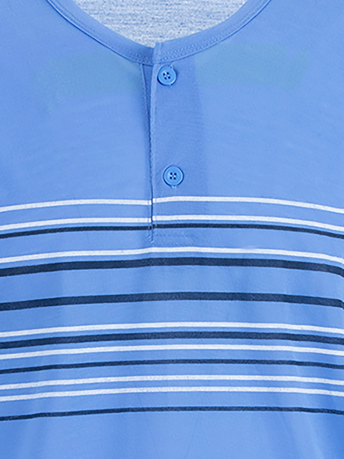 Der Pyjama hat ein klassisches Design: Oberteil mit einem Streifenmuster und die Schlafanzughose ist uni gehalten. Angenehmer Tragekomfort gerade im Sommer.