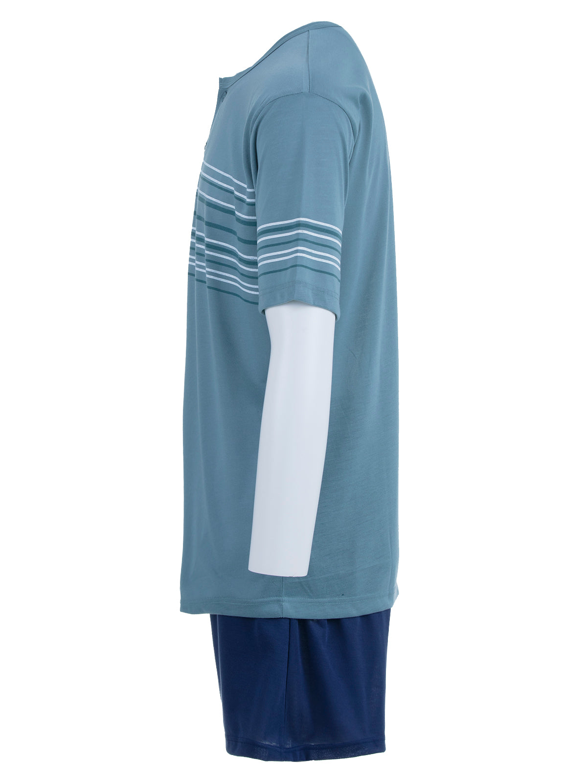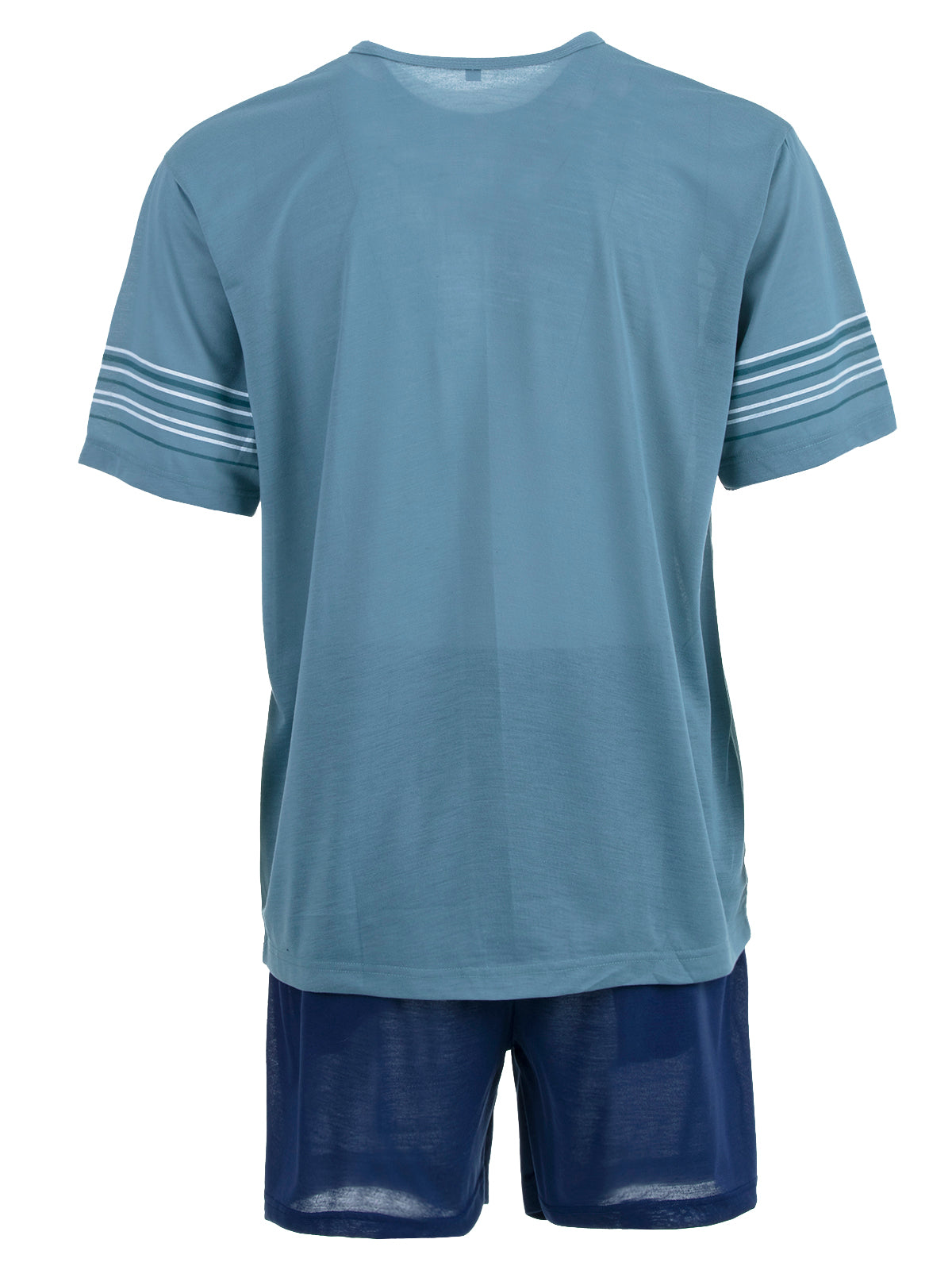 Dekorativer zeitloser Schlafanzug. Der Herrenschlafanzug ist angenehm auf der Haut zu tragen und hat einen Rundhals-Ausschnitt. Die kurze Schlafanzughose hat einen Dehnbund.
