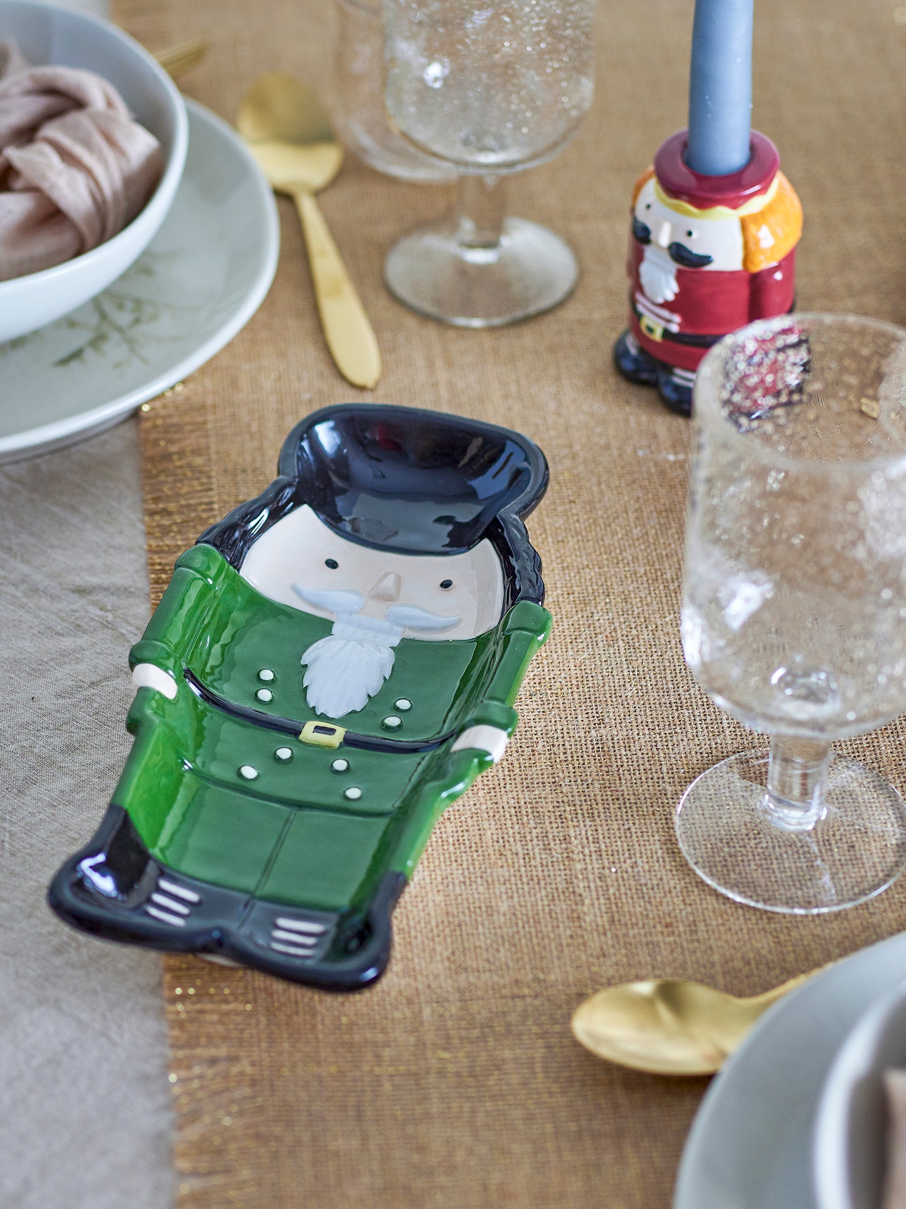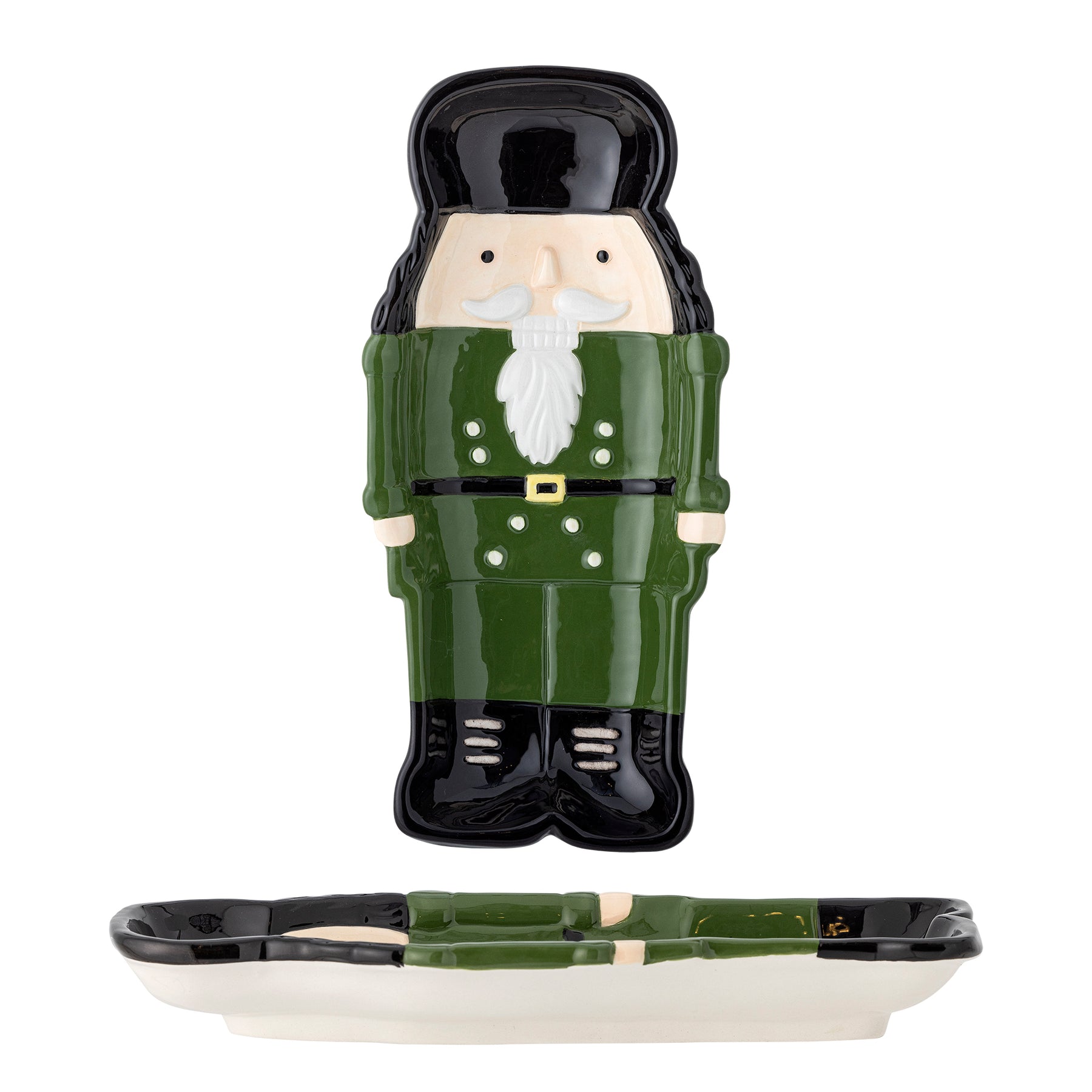 Mit großer Sorgfalt von Hand bemalt, hebt es die ikonischen Details des Nussknackers von seinem charakteristischen Hut bis zu den glänzenden Knöpfen an seiner Jacke hervor. Die lebendige grüne und schwarze Glasur verleiht dem Tablett einen modernen Touch, während es der traditionellen Weihnachtspalette treu bleibt. Da das Tablett handbemalt ist, können Variationen in den Farben und der Farbintensität auftreten.