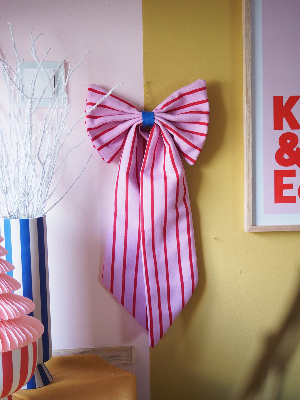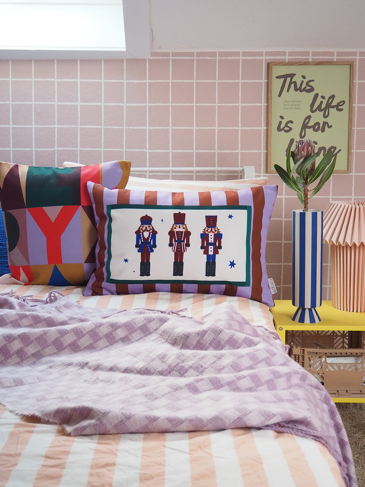 Frische Farben, modernes Design: Unser Kissenbezug mit 3 Nussknackern auf Streifen in plum & rosé bringt sofort Weihnachtslaune in dein Zuhause.