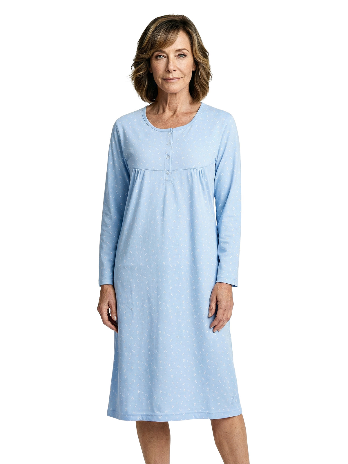 Mit langen Ärmeln und kleiner Raffung kombiniert es klassische Elemente mit modernem Design. Die kleine Knopfleiste ermöglicht ein einfaches An- und Ausziehen und verleiht dem Nachthemd einen zusätzlichen Hauch von Raffinesse.