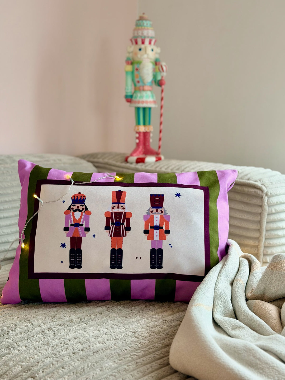 Frische Farben, modernes Design: Unser Kissenbezug mit 3 Nussknackern auf Streifen in grün & rosé bringt sofort Weihnachtslaune in dein Zuhause.