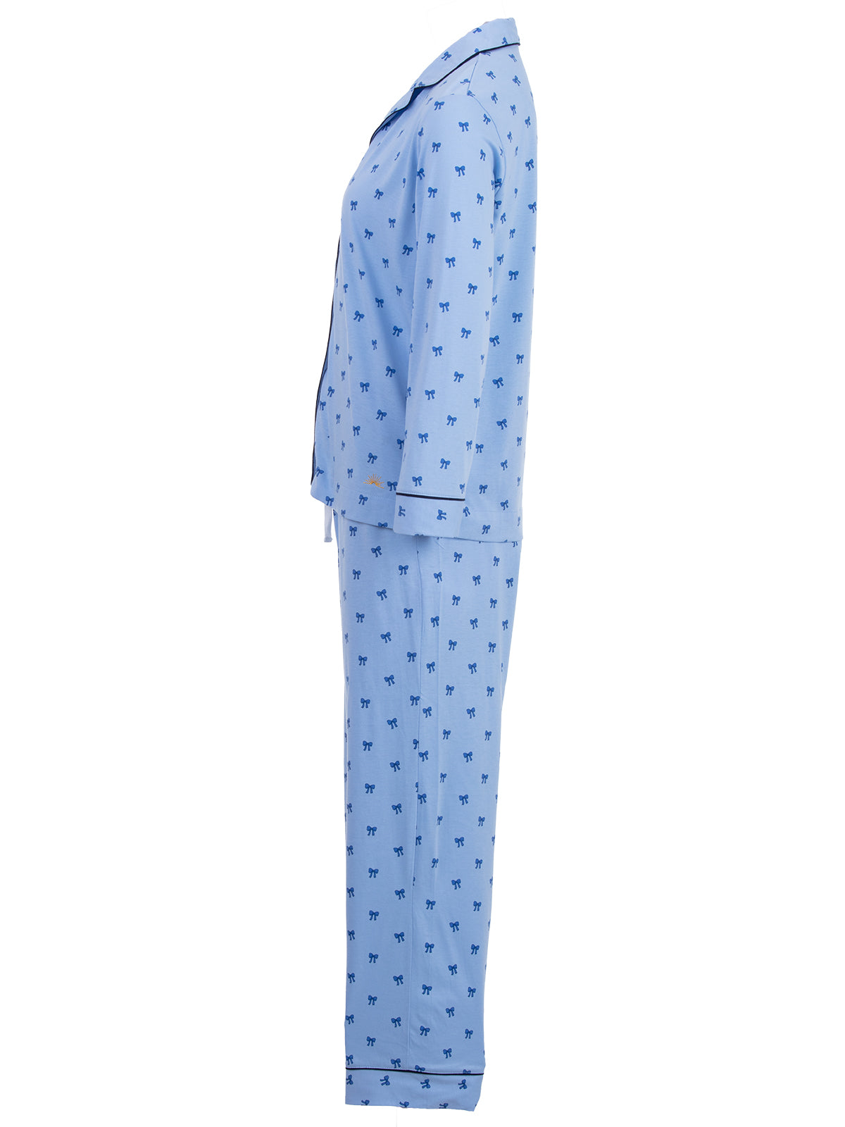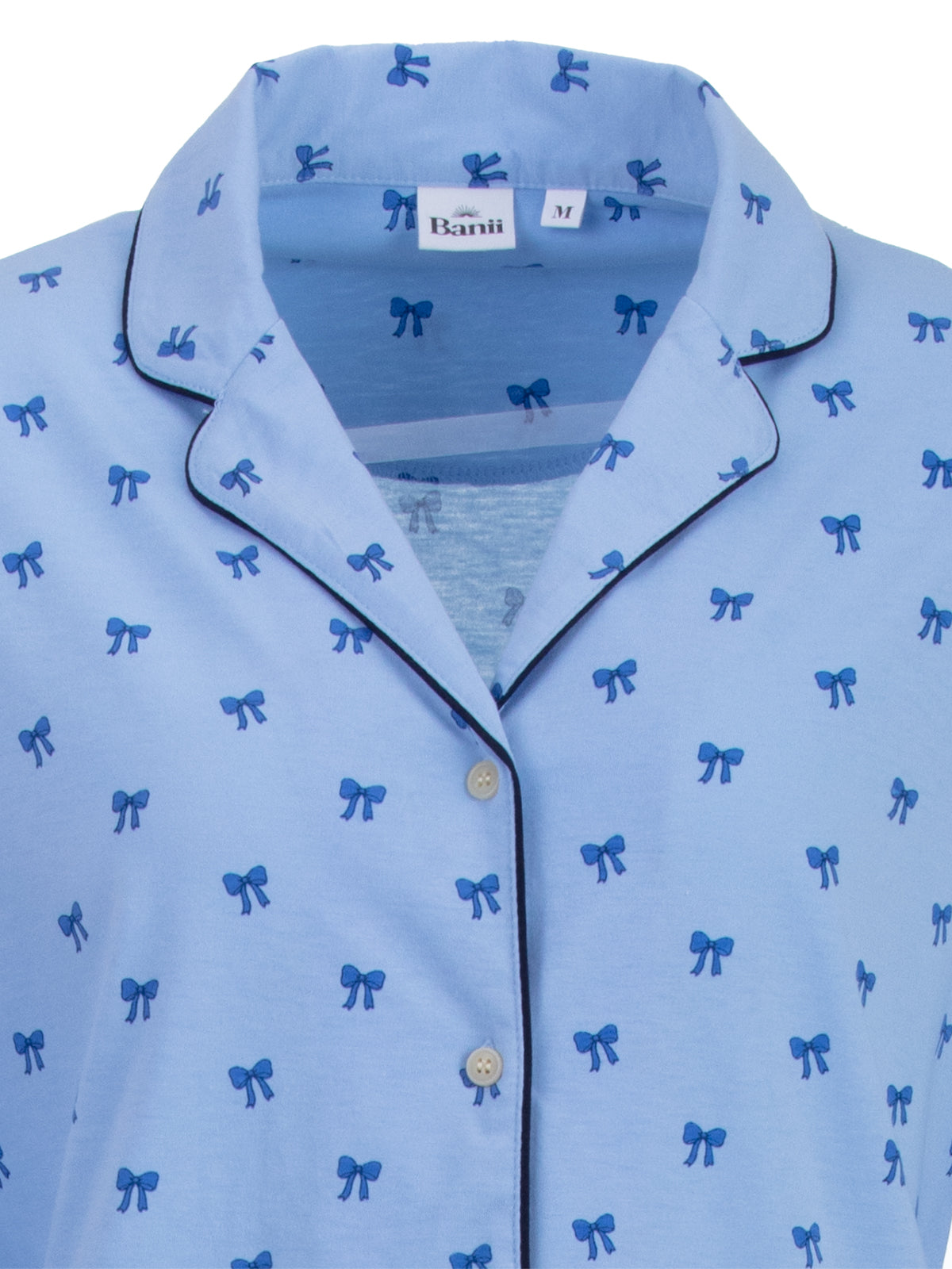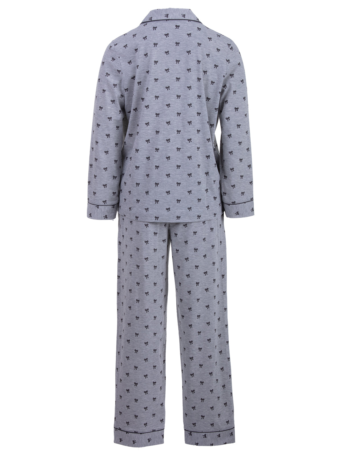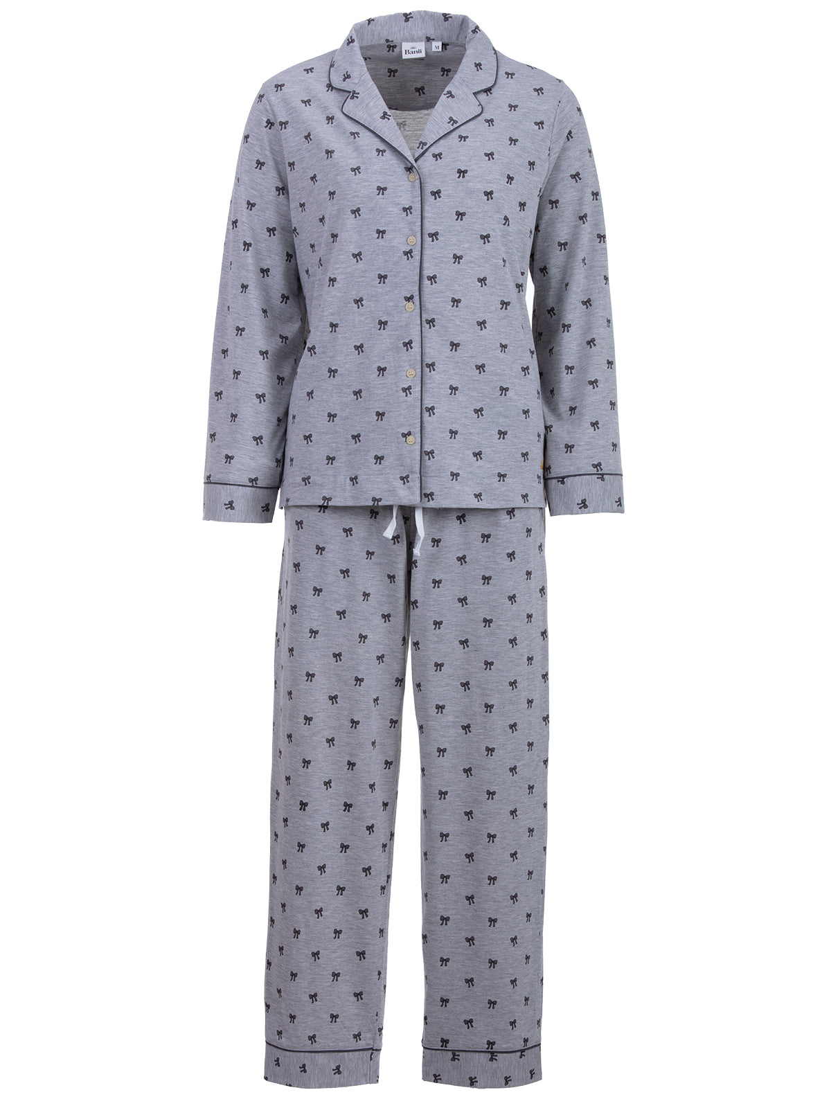 The pajamas, made of soft, flowing single jersey, feel wonderfully soft against the skin. The all-over print features a design of small bows. The top of the pajamas is buttoned throughout and can be completely opened. The long pants have an elastic waistband.