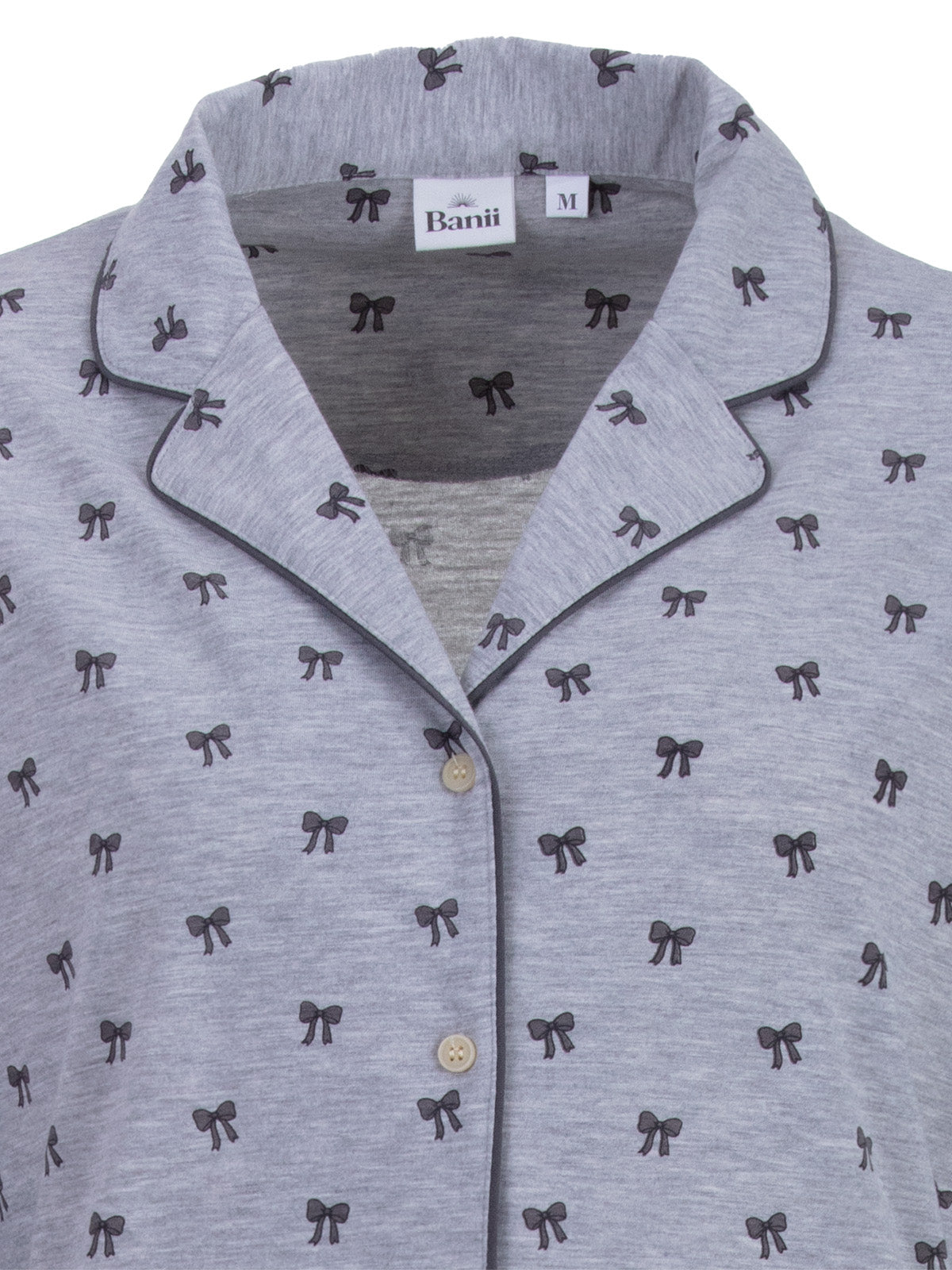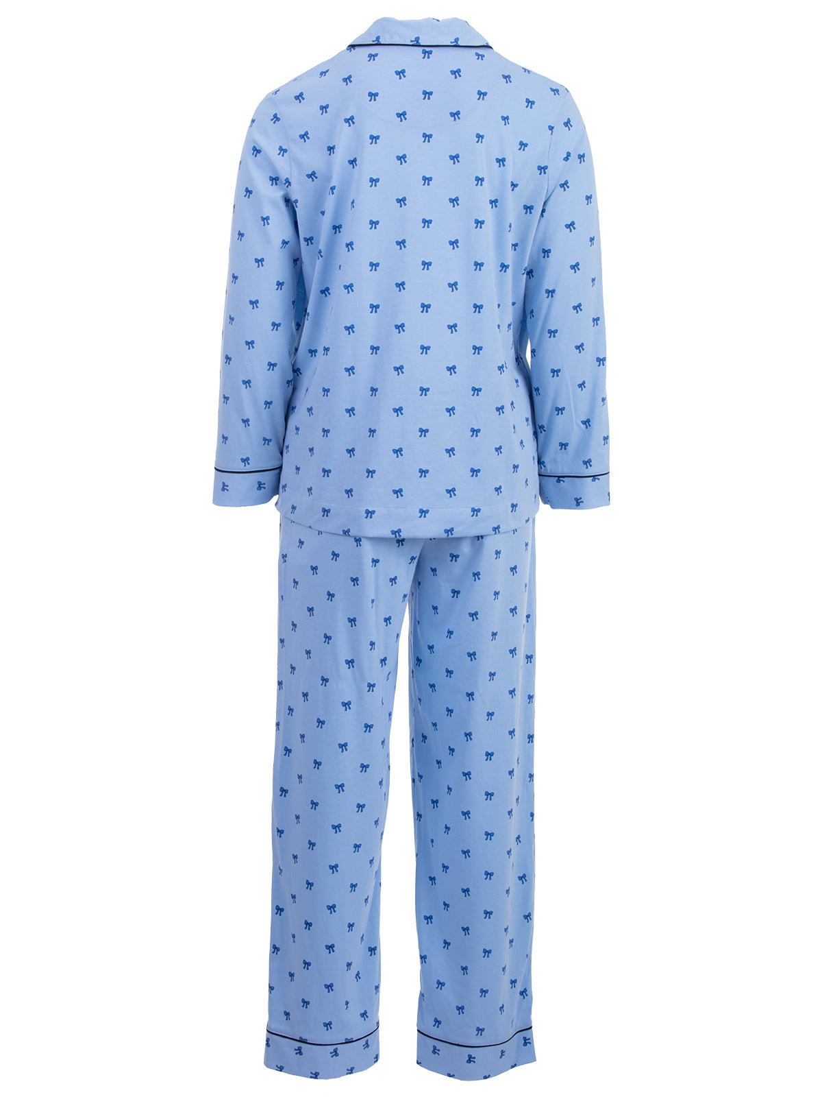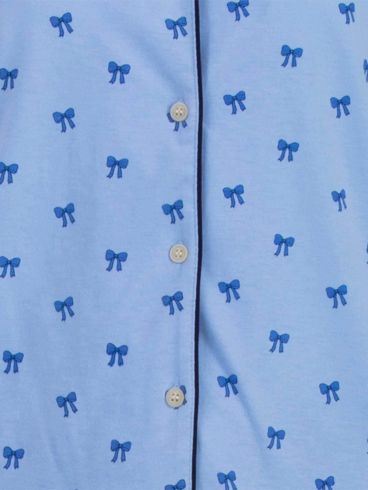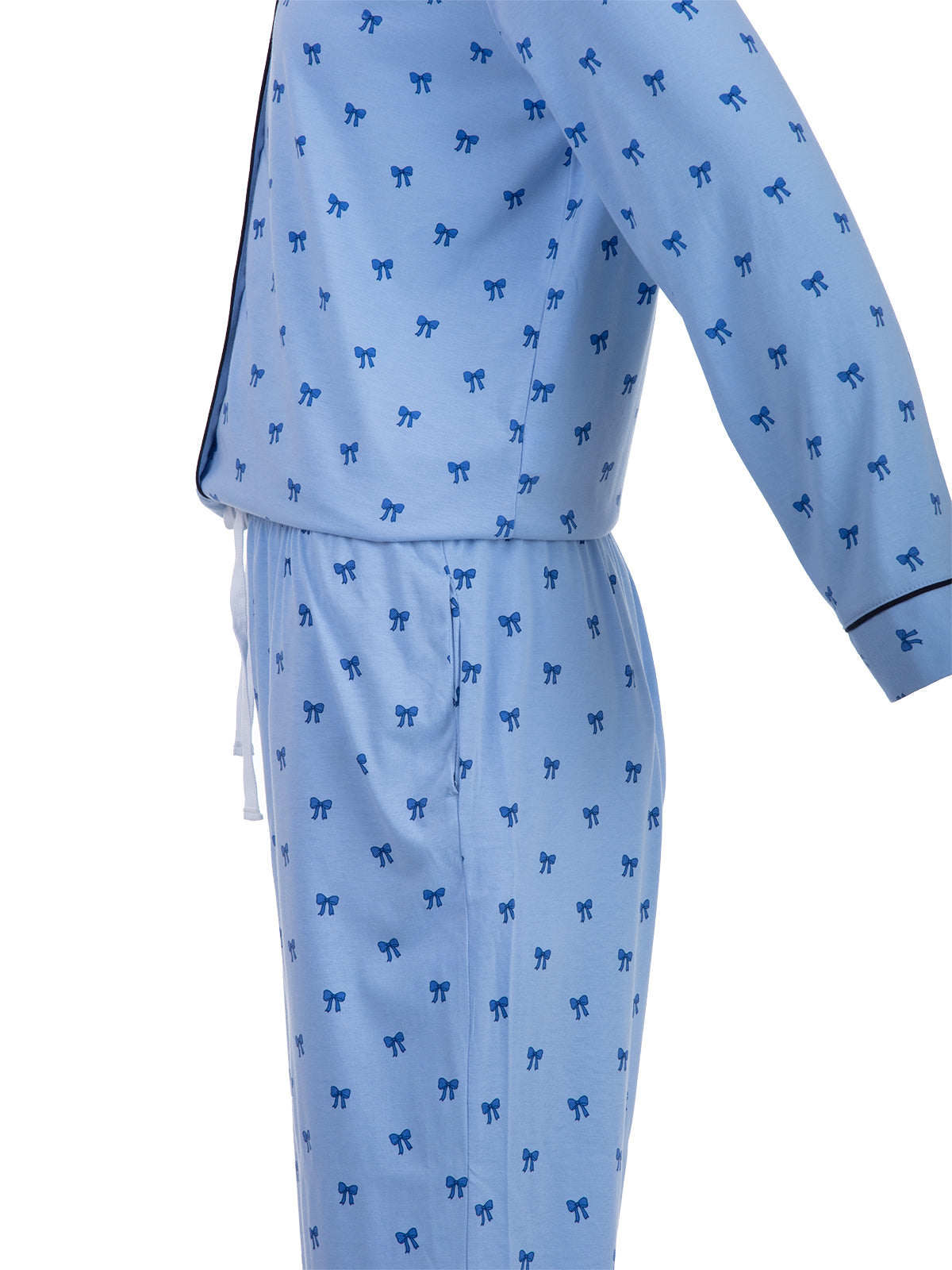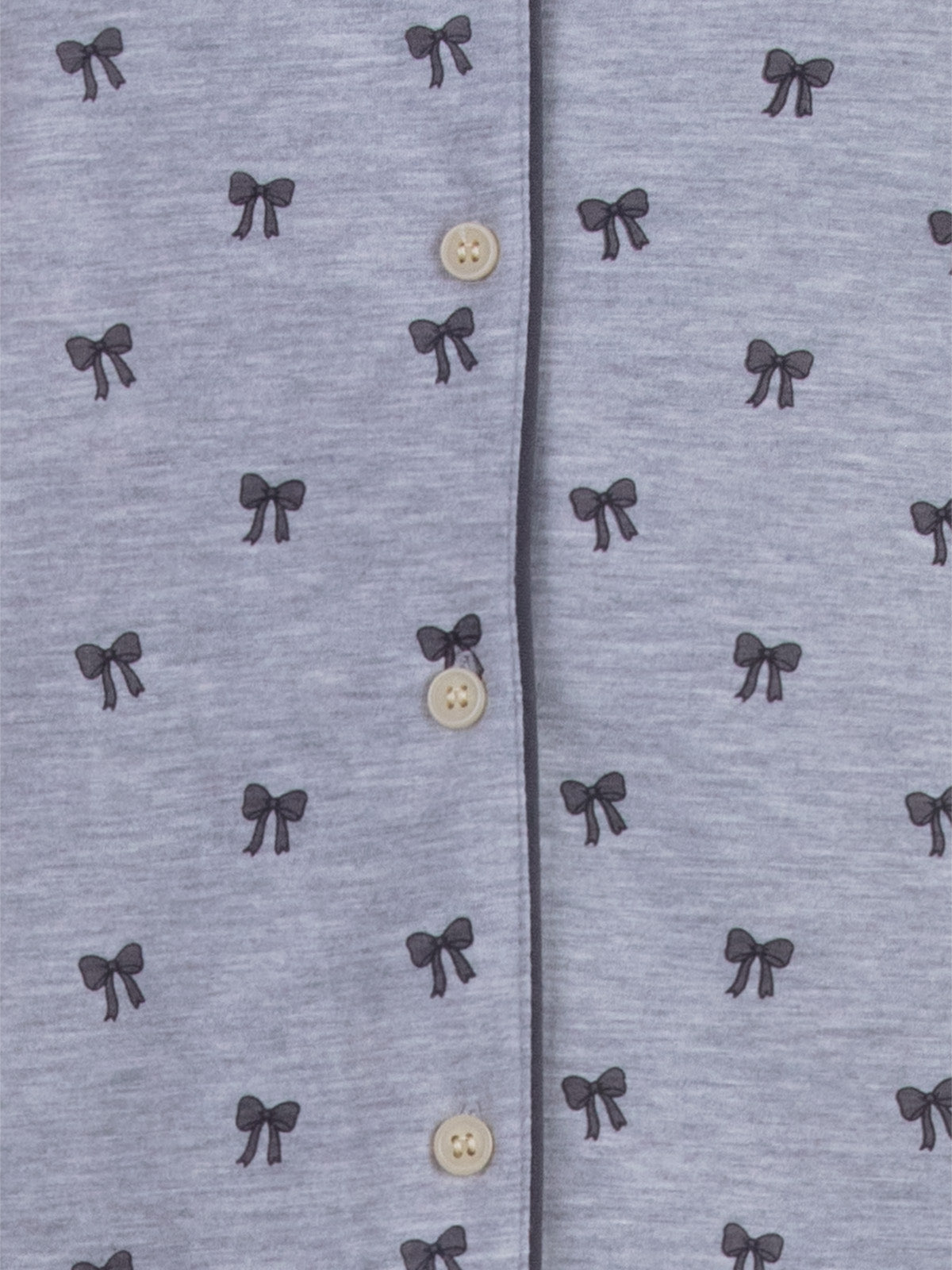 The pajamas, made of soft, flowing single jersey, feel wonderfully soft against the skin. The all-over print features a design of small bows. The top of the pajamas is buttoned throughout and can be completely opened. The long pants have an elastic waistband.