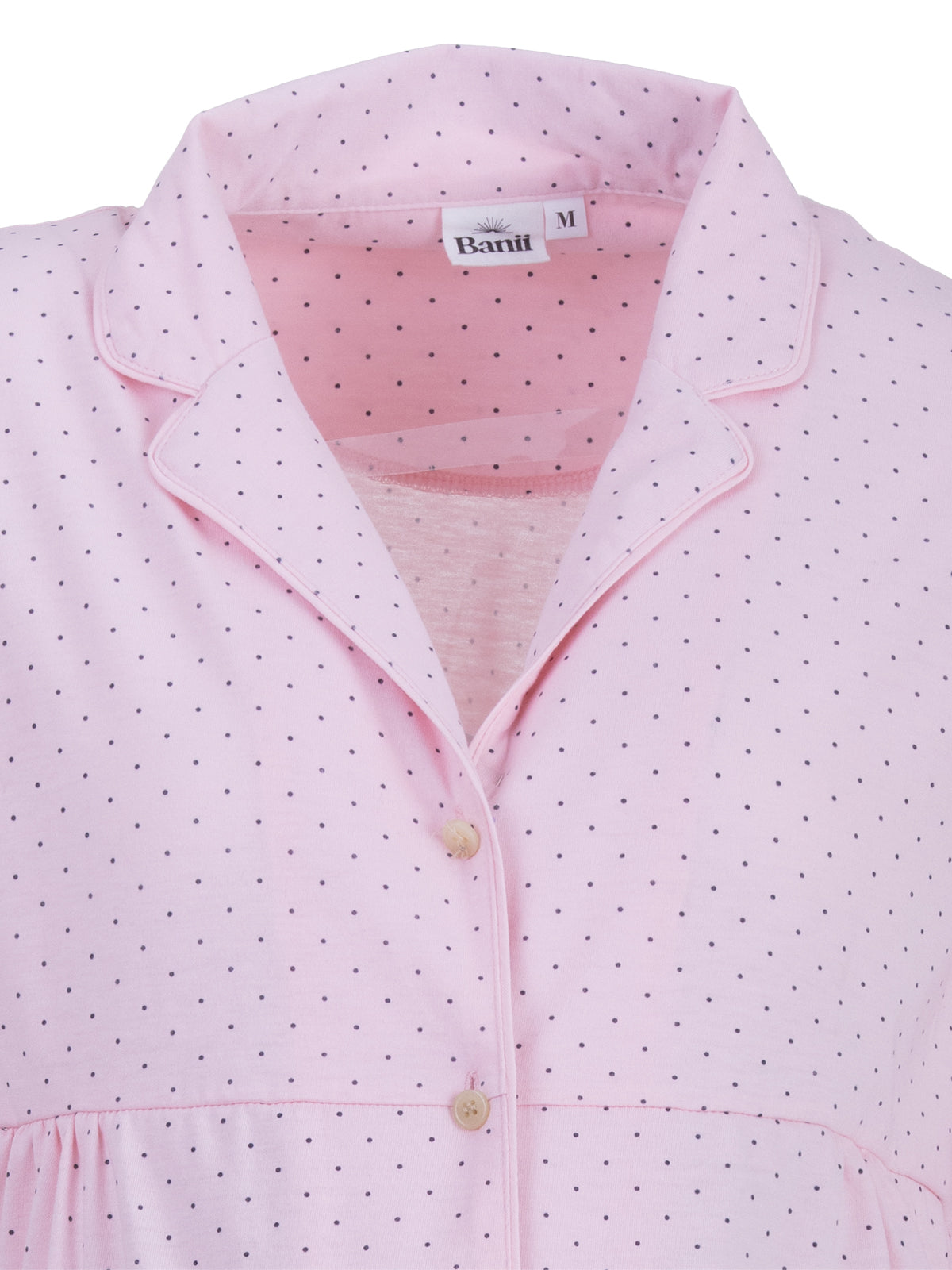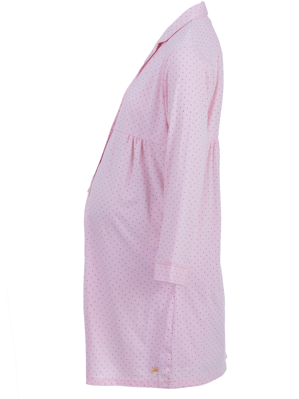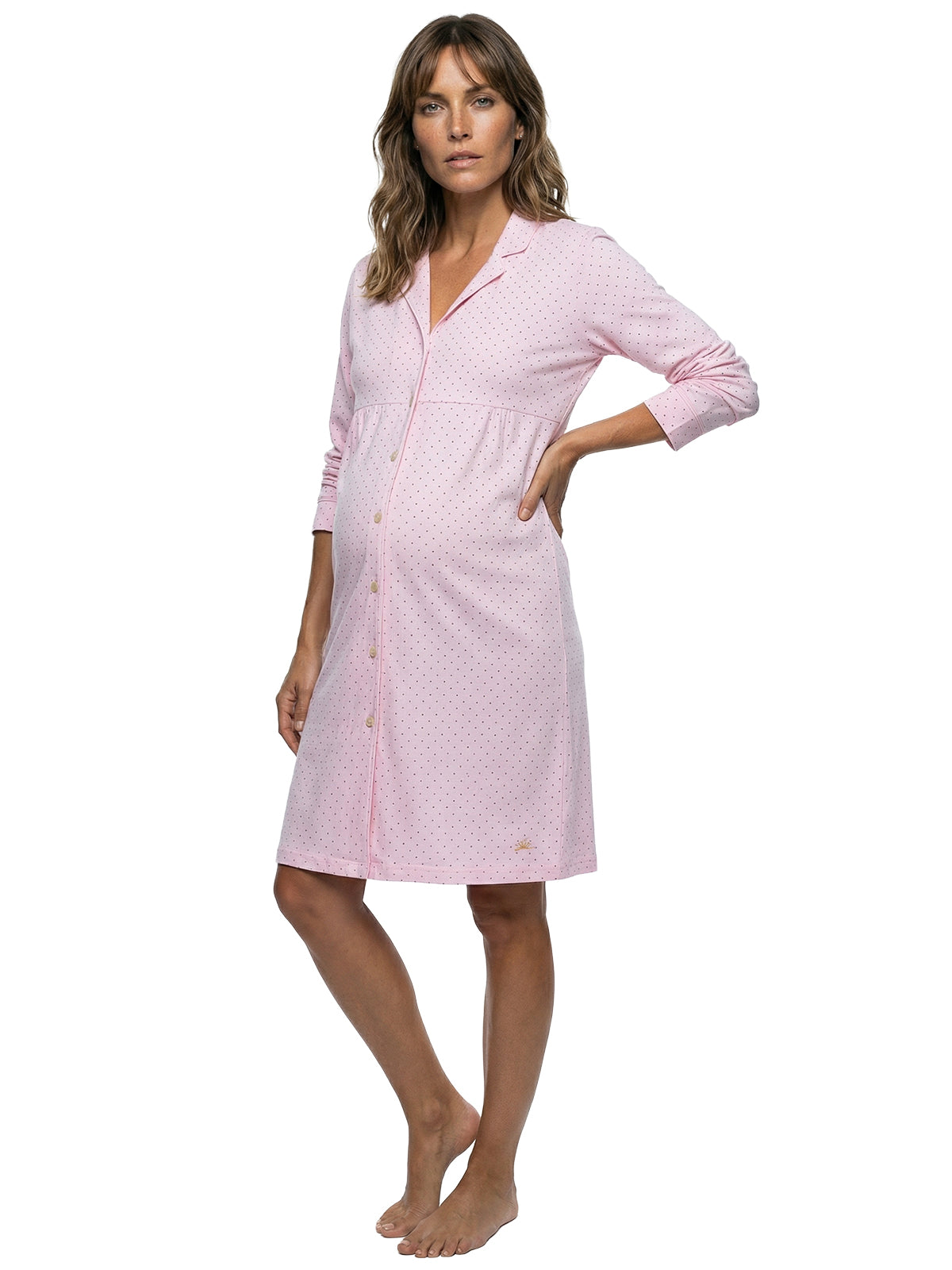 This stylish nightgown with small polka dots is the perfect companion for expectant and new moms. The comfortable design combines functionality with a modern look—ideal for pregnancy, hospital stays, and breastfeeding. It's available in pink, mint, or fuchsia.