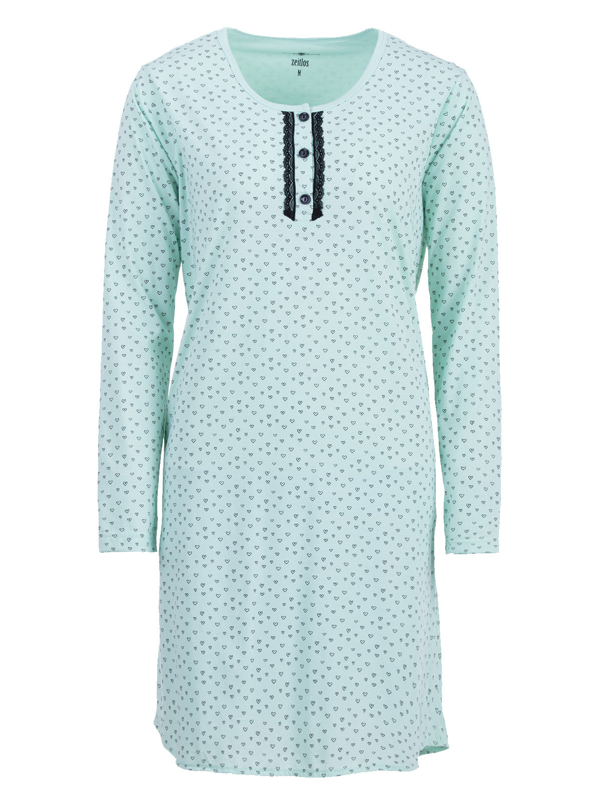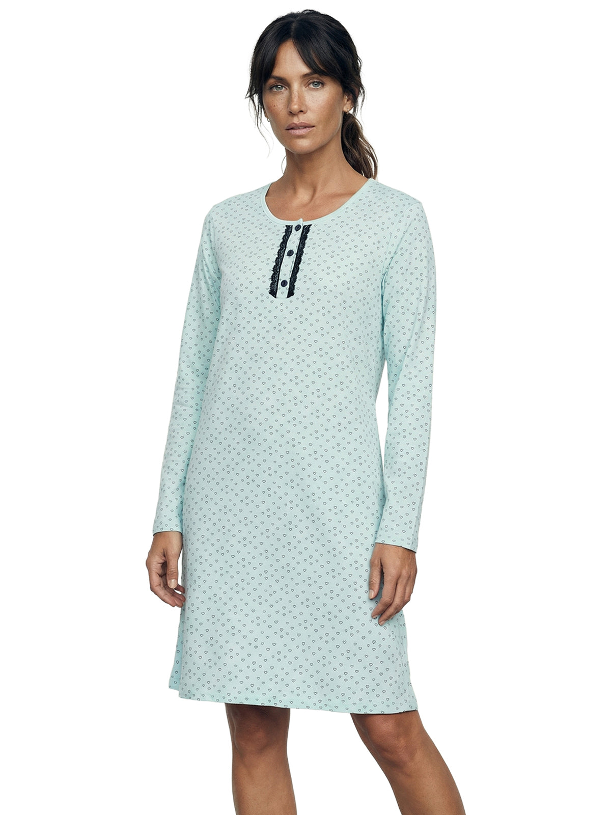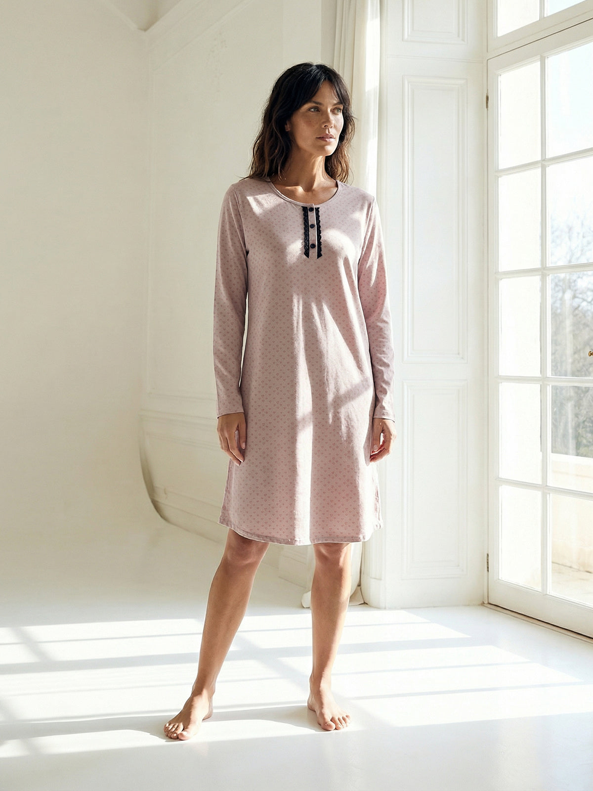 With long sleeves and a lace neckline, it combines classic elements with a modern design. The small button placket allows for easy dressing and gives the nightgown an extra touch of sophistication.