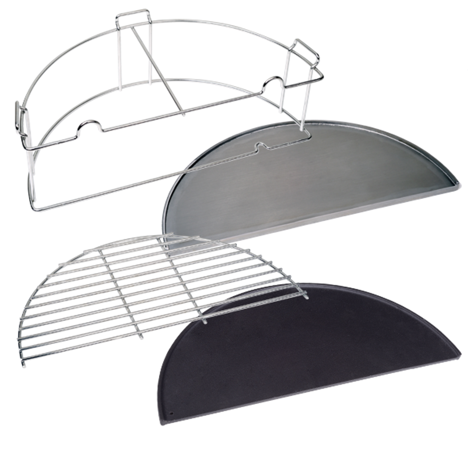 The set consists of: 1x chrome riser 1x cast iron plate 1x stainless steel grill plate 304° 1x stainless steel grill grate 304°