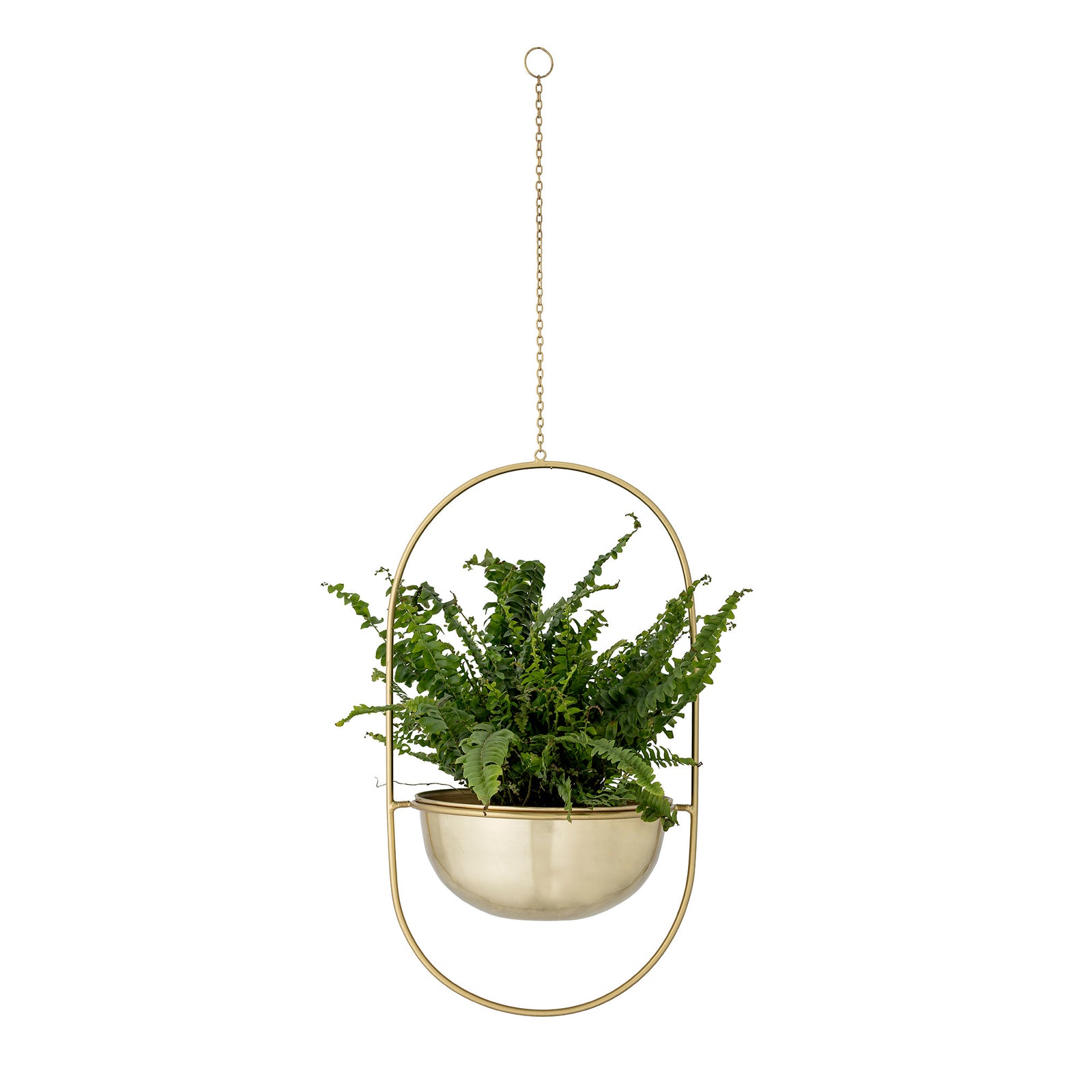 A hanging basket made of iron painted in a beautiful golden colour. The frame, which is made entirely of iron, has dimensions of Ø21.5xL80xH47xW26 cm .
