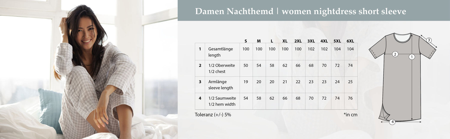 Im Bereich Nachtwäsche legen wir Wert darauf, dass für jeden Geschmack, Anspruch und Größe, unsere großen Größen reichen bis 6XL, die passende Nachtwäsche dabei ist. Selbstverständlich sind alle unsere Produkte Maschinenwäsche und trocknergeeignet. Wir hoffen unsere Kollektion an Damenbekleidung, Nachtkleidern, Homewear und Schlafanzügen wird Sie ebenso begeistern wie uns.